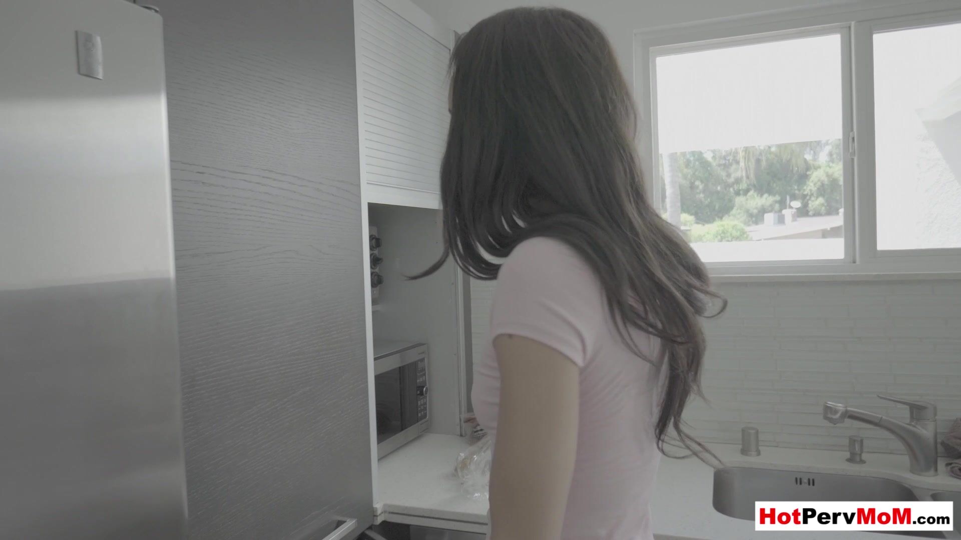 Raven haired latina MILF stepmom Gia Vendetti with small tits bending down and her bubble butt makes her stepsons big cock hard She notices that and grabs it to give him a blowjob and take a taboo ride on it