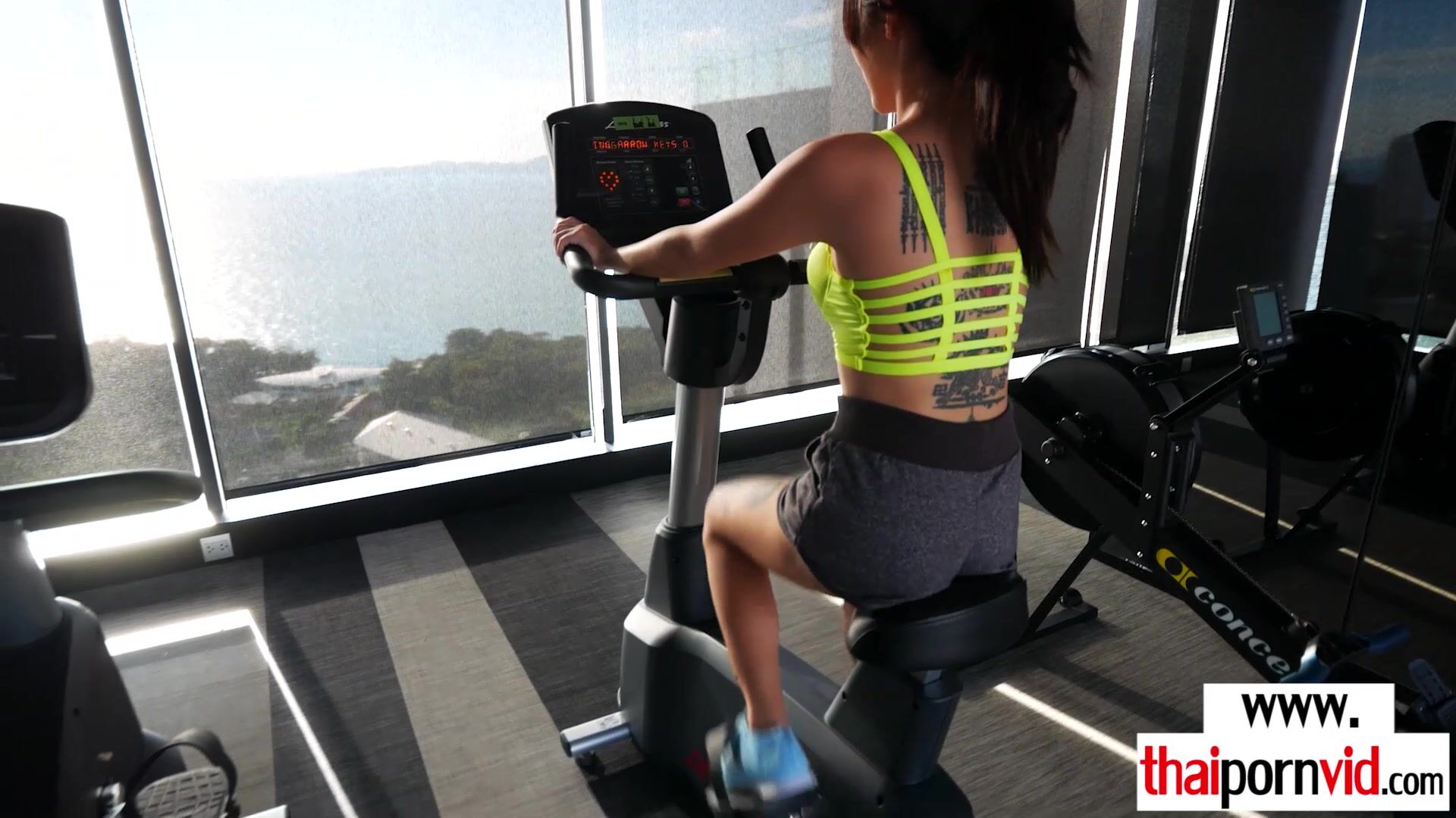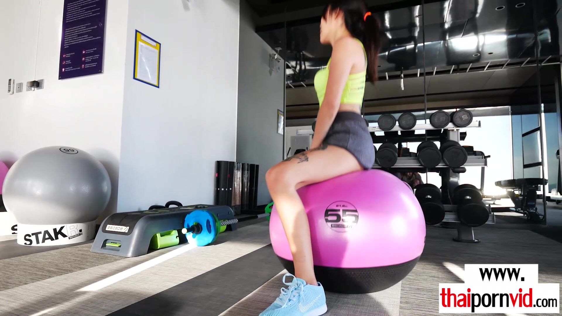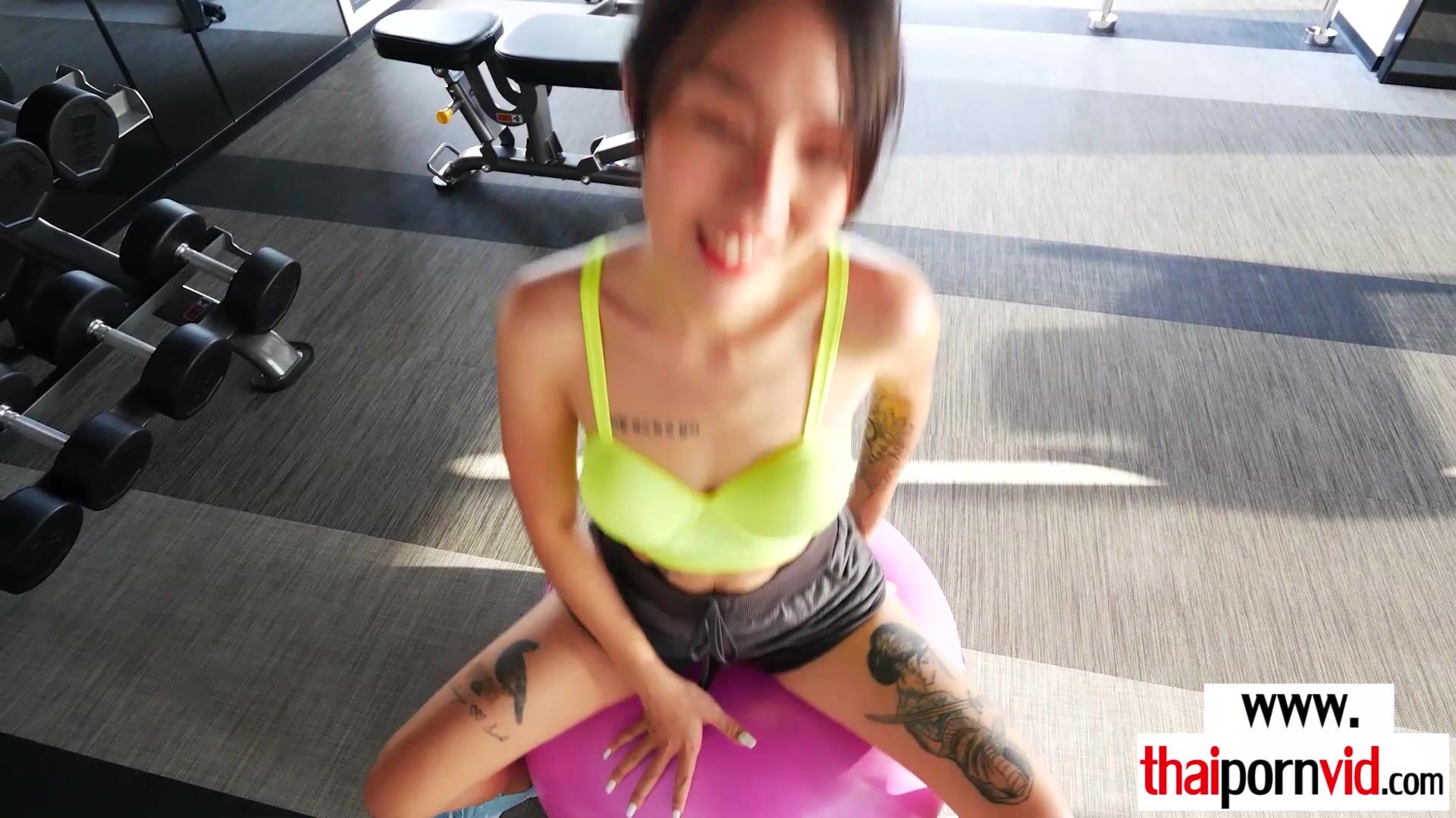 Sexy amateur Thai teen Noomai with tiny tits doing her daily workout on a yoga ball then she takes her european lovers big white cock to empty his saturated balls and get his seeds so she starts sucking the dick then offers her asian pussy for a fuck