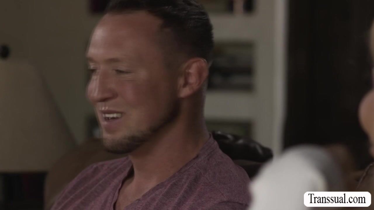 Blonde ladyboy rides Pierce Paris big cock on couch