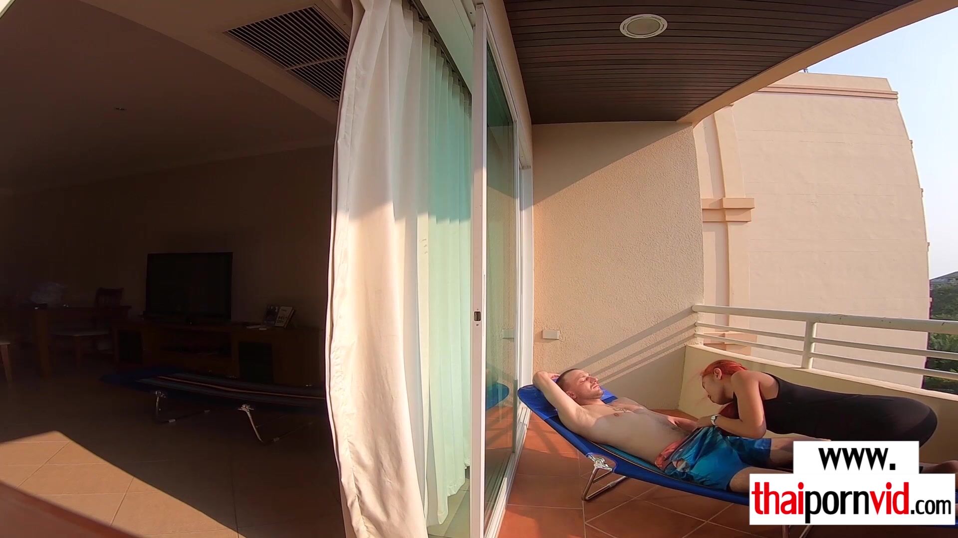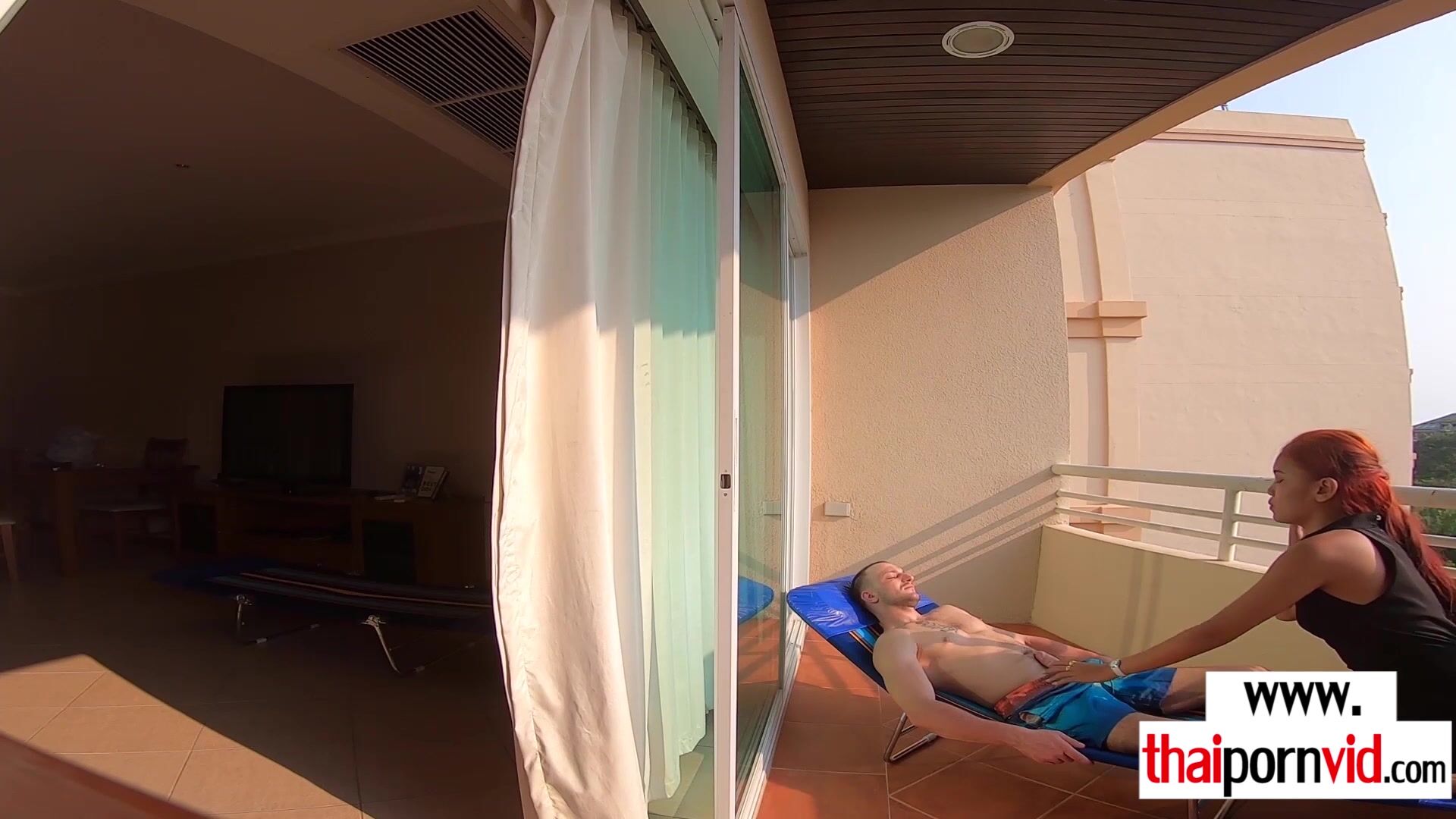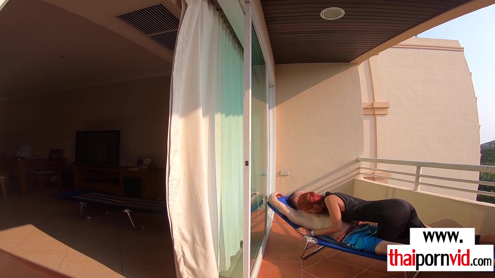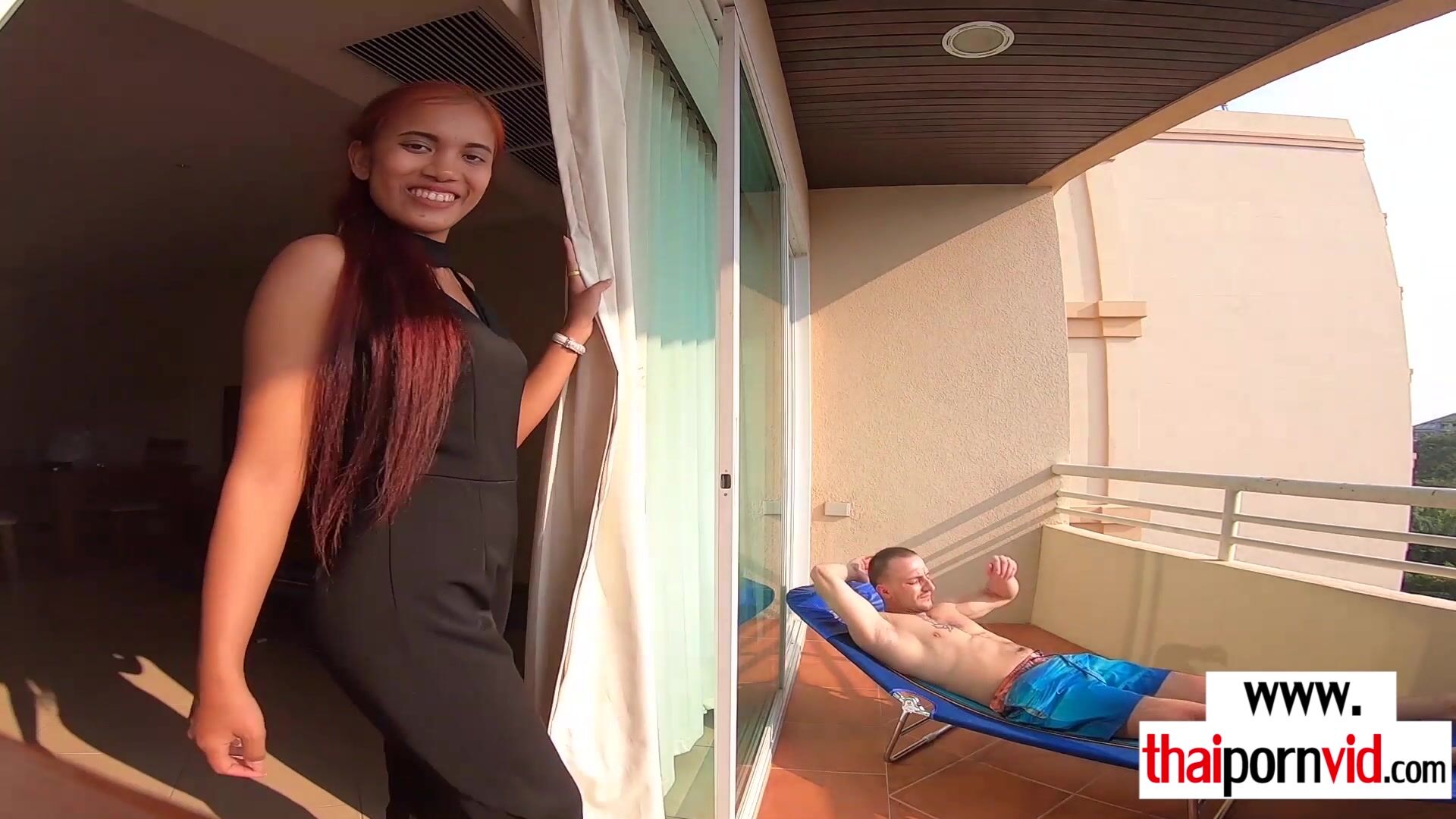 Petite amateur Thai teen Cherry with small tits and her european lover arrive home The guy wants some rest but the naughty slut needs his big white cock so she gets on her knees and after a blowjob she takes a ride on it