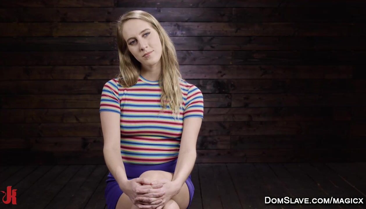 Hairy pussy blonde babe Cadence Lux in sideways suspension gets machine fucked then on her back with wrists rope tied pussy fucked and vibrated with Hitachi
