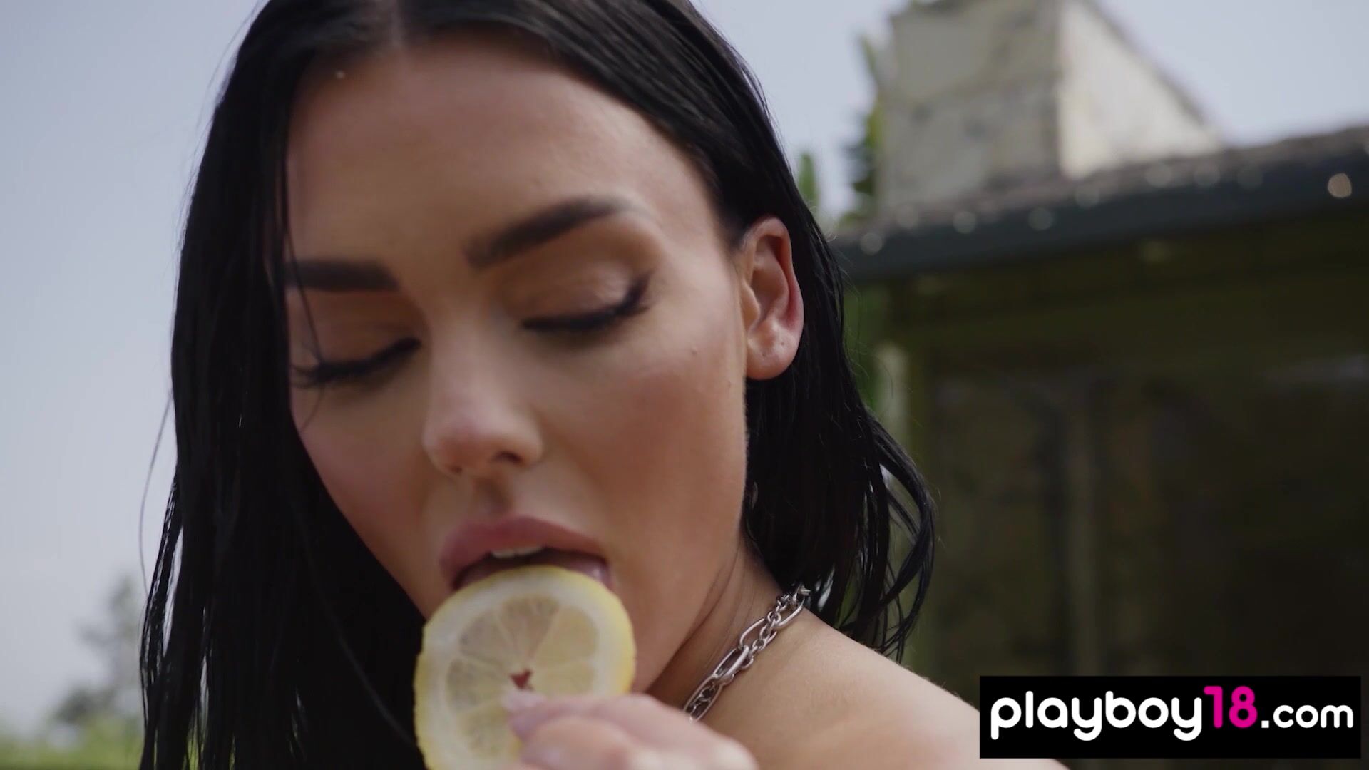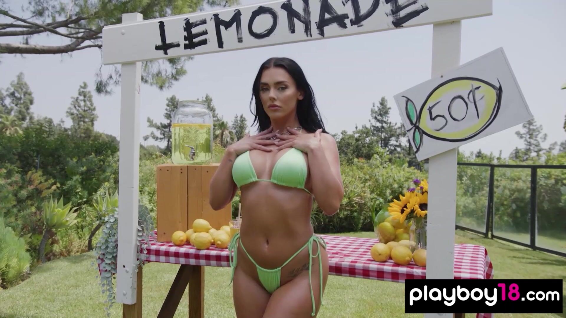 Hot brunette babe with big fake boobs named Kaitlynn Anderson tries to sell lemonade She wants to get more money so she takes off her tiny yellow bikini and the naked babe is posing and flashing her fresh pussy on the counter outdoor