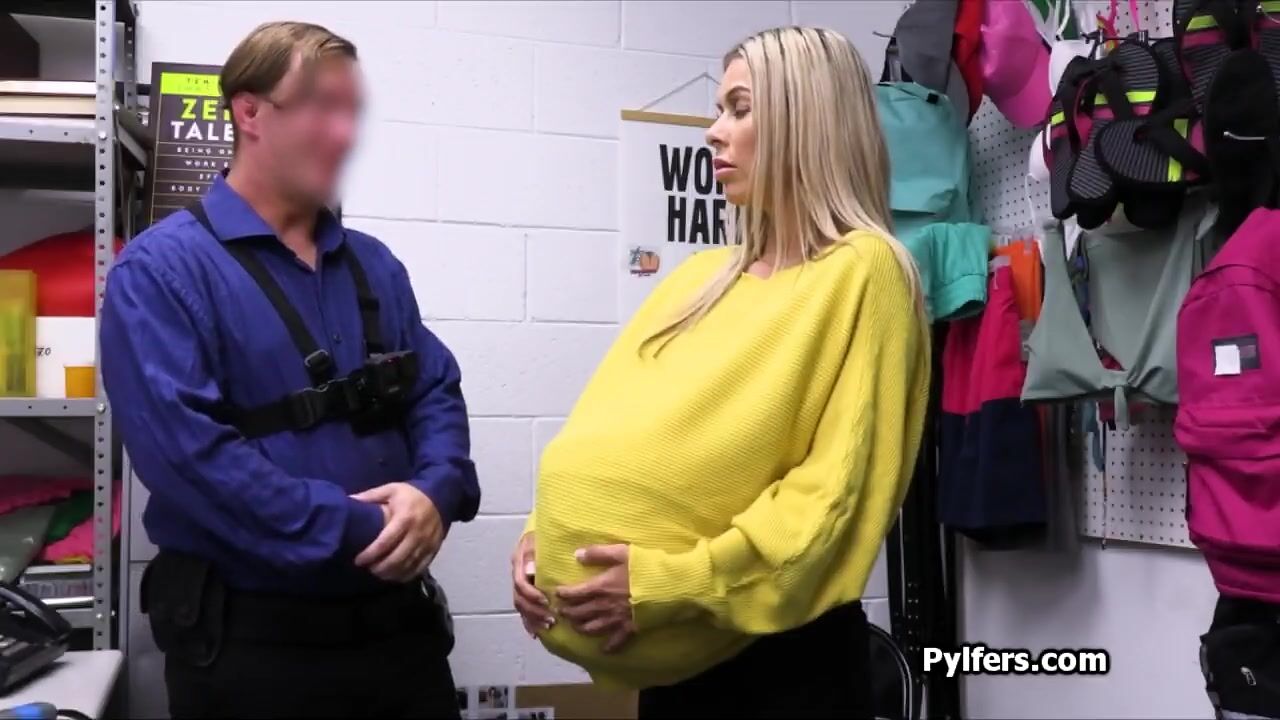 Blonde beauty Summer fakes pregnancy in order to steal some goods using her fake belly. But she gets caught.. then fucked as well by the mall cop!