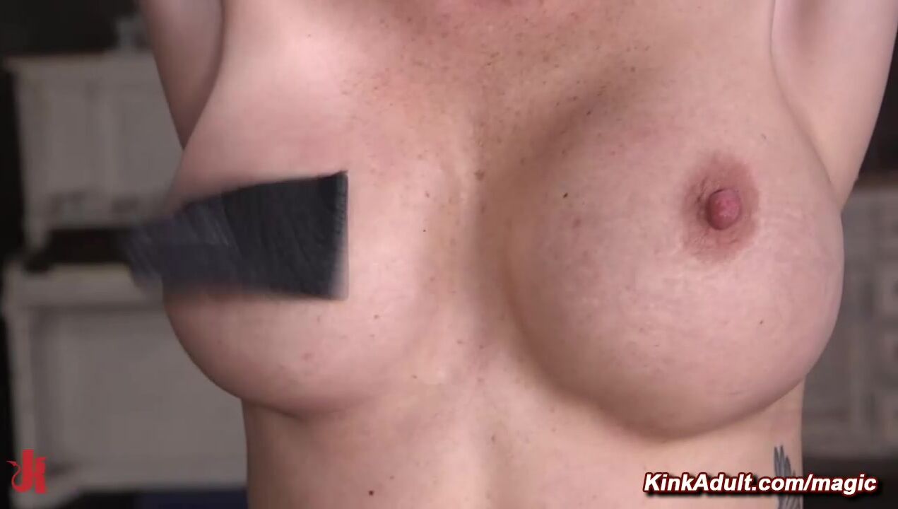 With a gag ball in mouth big tits blonde Astrid Star in eagle spread standing bondage gets flogged and pussy vibrated then rough fucked by slave coach Ramon Nomar in rope bondage