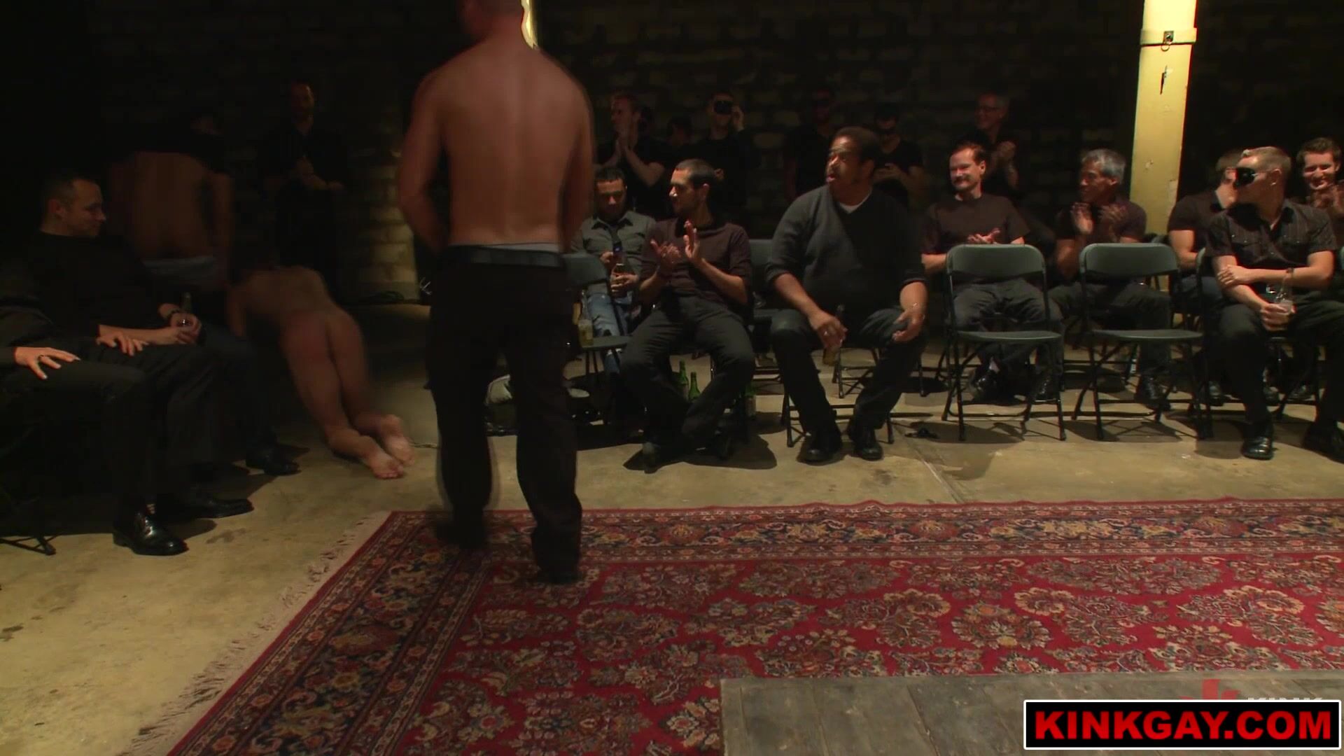 Poor dude bound and stripped naked in front a room full of horny men! It's as if the devil himself sent an invite to this fucked up sinful party! The crowd roars with excitement as our superhero Trent Diesel gets fucked, flogged, spanked, used and [censored]d!