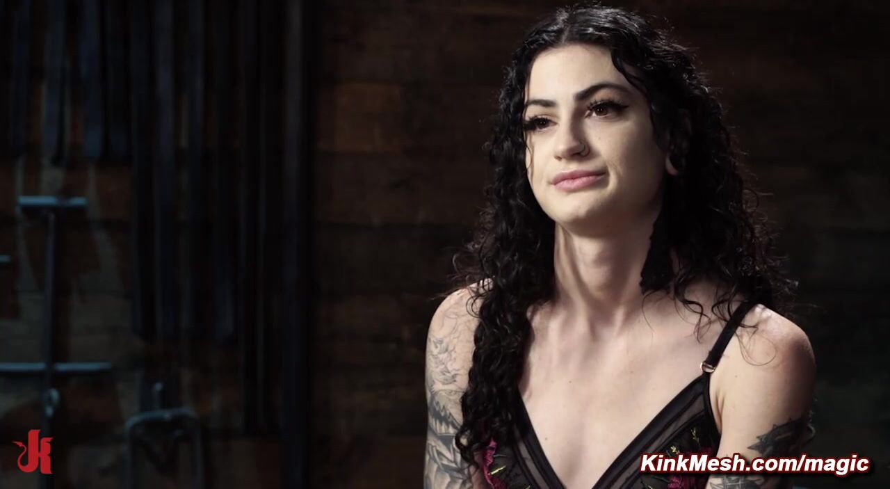 Tattooed petite pain slave Lydia Black is chained to wooden post and tazzapered then in metal device bondage with ass in the air fucked with dick on a stick by master The Pope