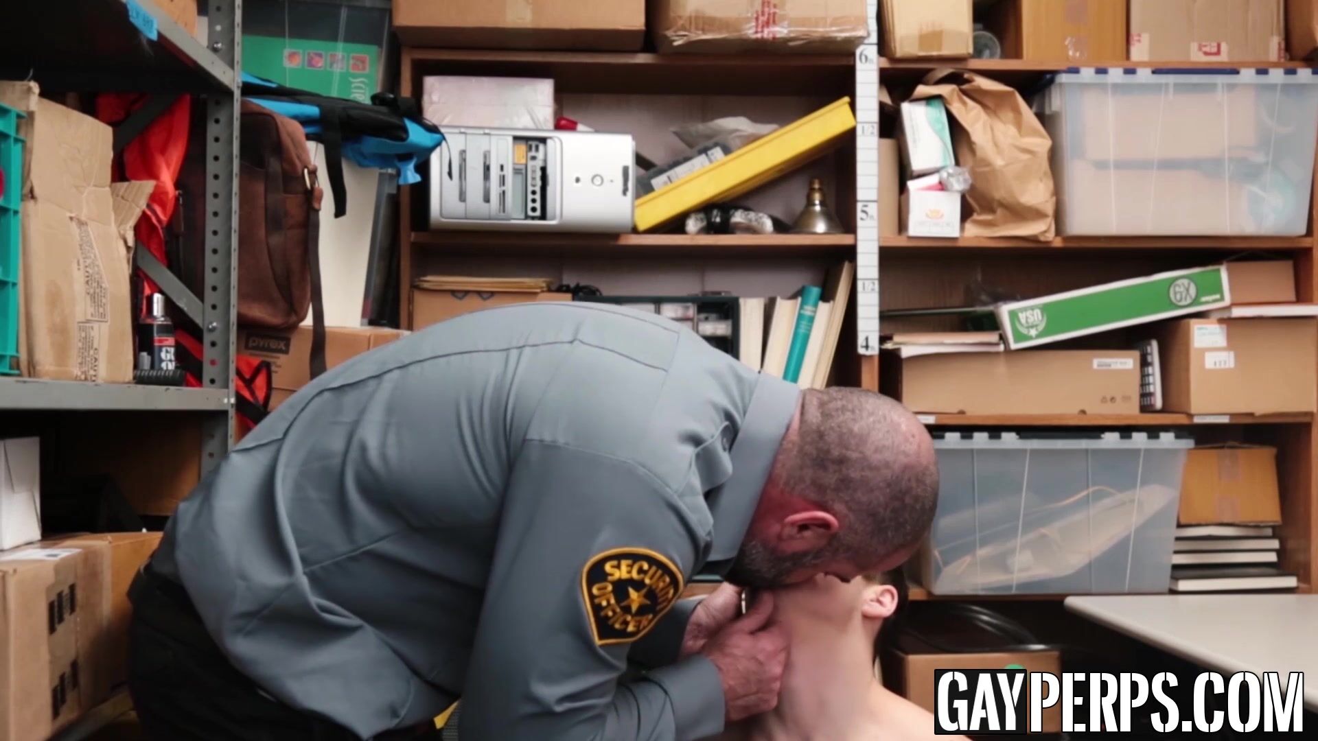 Twink sucks on a girthy chode from a mature bearded security guard to be let go without police involvement