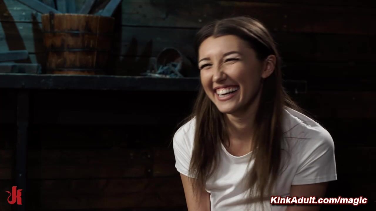 Master The Pope puts petite brunette slave Maya Woulfe in a single point hip suspension that has her inverted then clamps her nipples and pulls and ties to wooden post by the rope