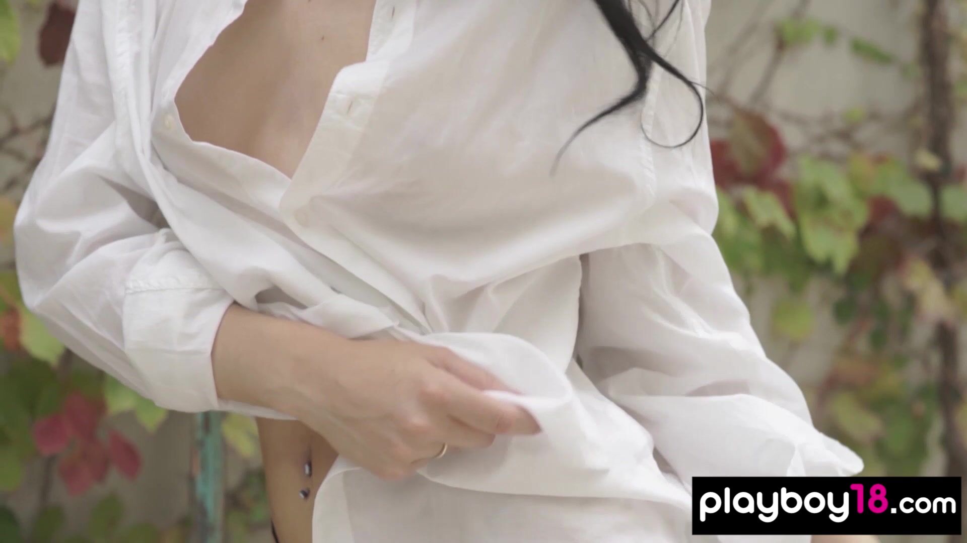 Bombastic brunette latina babe named Lauren O Conner with perfect natural tits is teasing in a sexy white shirt outdoor She looks seductively into the camera then she takes off her shirt and her tiny panties slowly to show her fresh pussy for Playboy