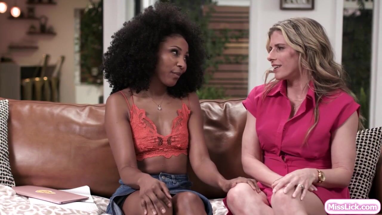 Ebony stepdaughter Olivia Jay is worried about the lesbian exam for she has no actual experience.Her blonde stepmom Cory Chase is teaching her how to kiss and lick pussy.The black babe gets so horny as she goes on scissoring with the big tits milf