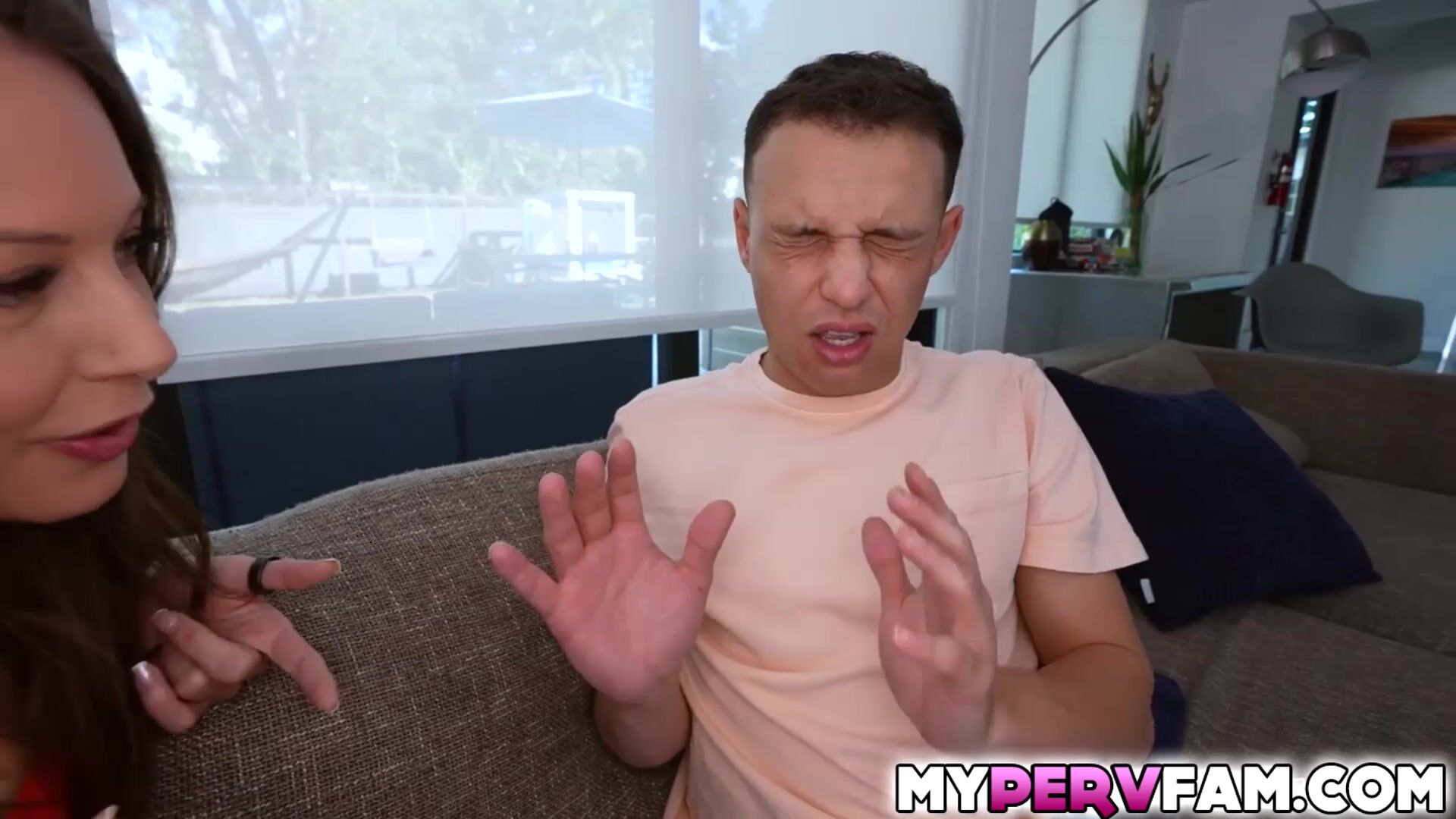 Johnny is even more taken aback when his stepmom Justine starts rubbing his shorts and pulling his dick out! She begins to suck her stepson, swallowing his big, hard cock. Justine feeds Johnny her juicy tits as she rides him hard. Johnny fucks his stepmom deeply