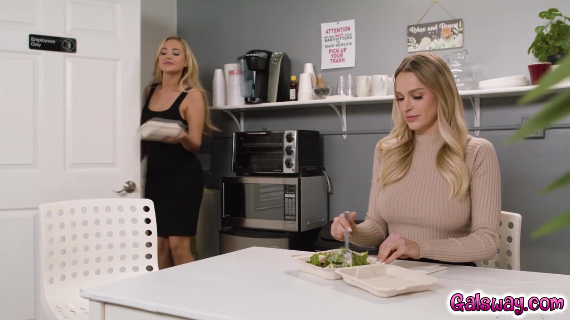 Blake Blossom and her coworker Emma Hix are having lunch together at work, which they like to do every day. Blake is eating her favorite lunch: a salad that has nuts in it. Blake offers Emma a bite of her meal, saying the nuts make it extra delicious