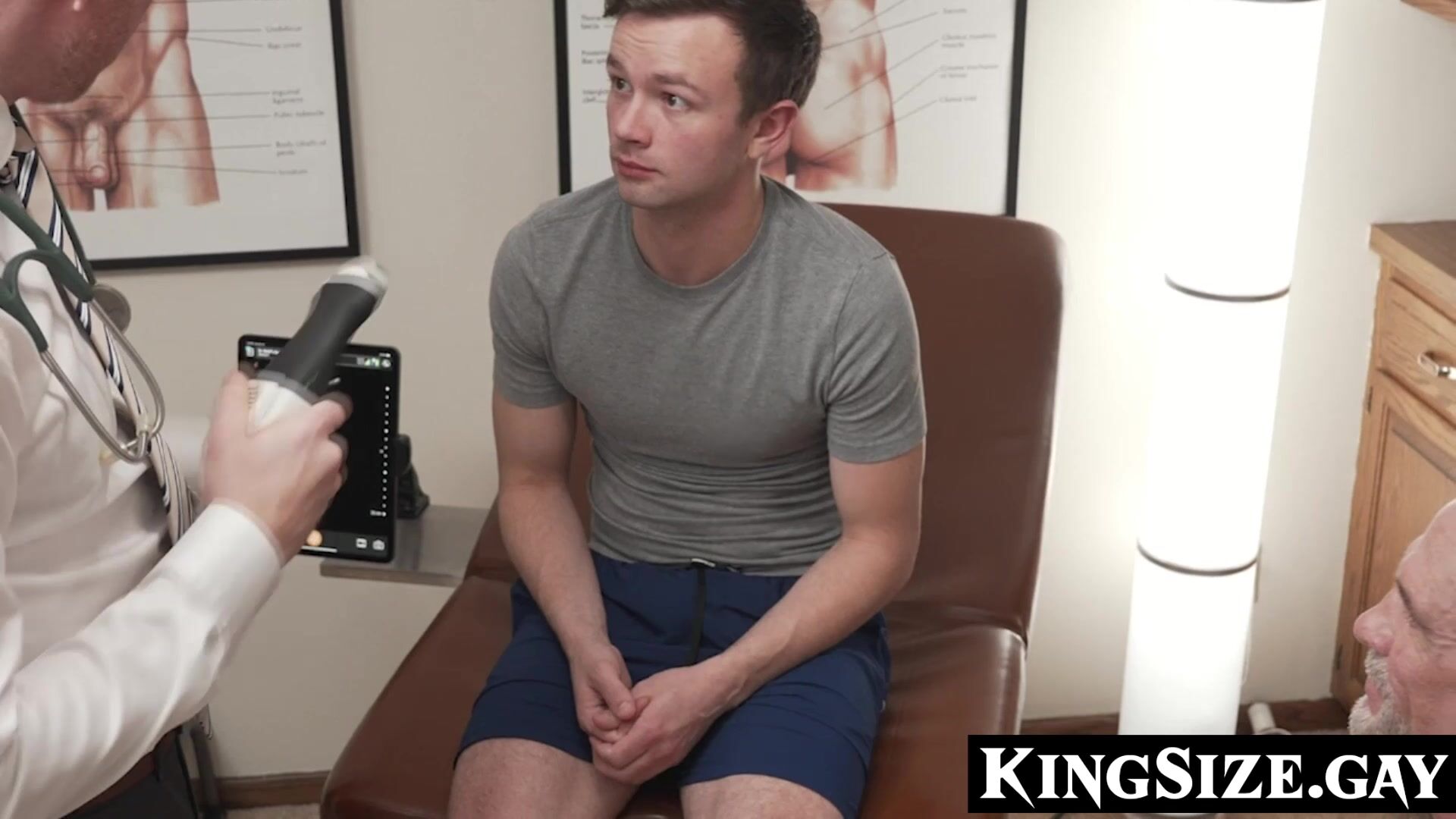 Logan, a long-time patient of Dr. Wolf, was surprised to find out that Mr. Steele, a patient of his, had also come for his routine physical. As Logan played on his phone, Dr. Wolf and Mr. Steele undressed Logan, and Mr. Steele entered the hole with his tongue