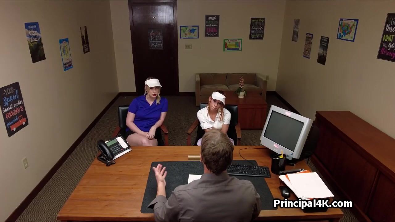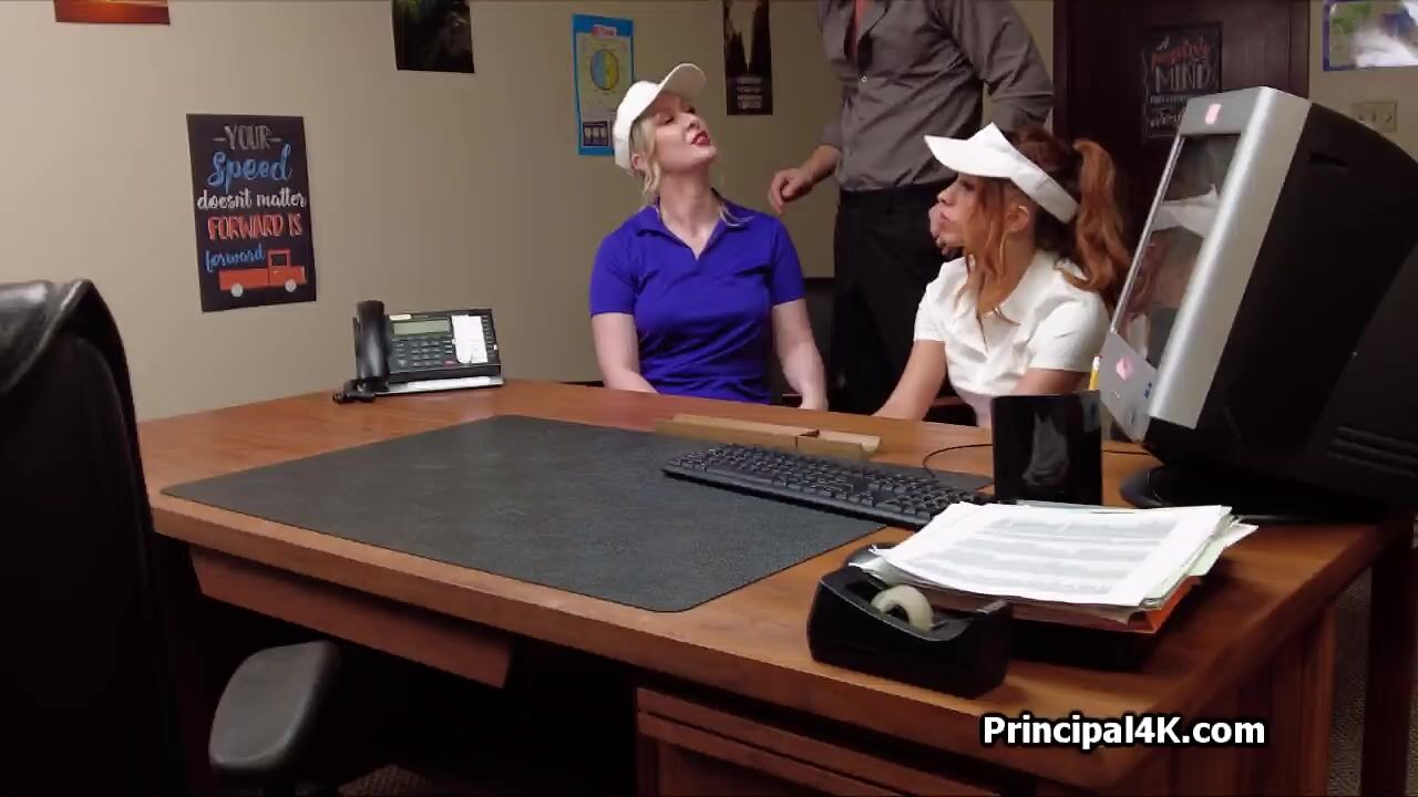 Sydney and Chloe show up in the principals office looking hot in sexy golf outfits. He got horny and wanted to fuck them both at once in the office!