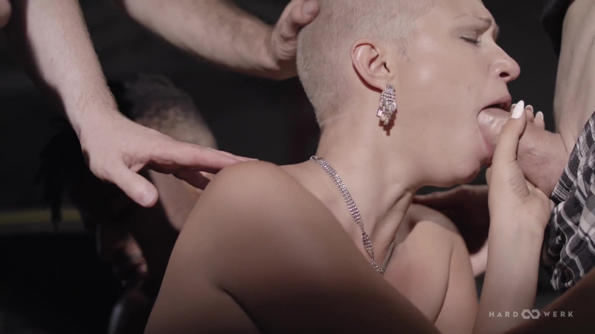 Gabi Gold drove into the car shop to the gawking stares of its assembled greasy gearheads. Within minutes, she was pleasing all four men!