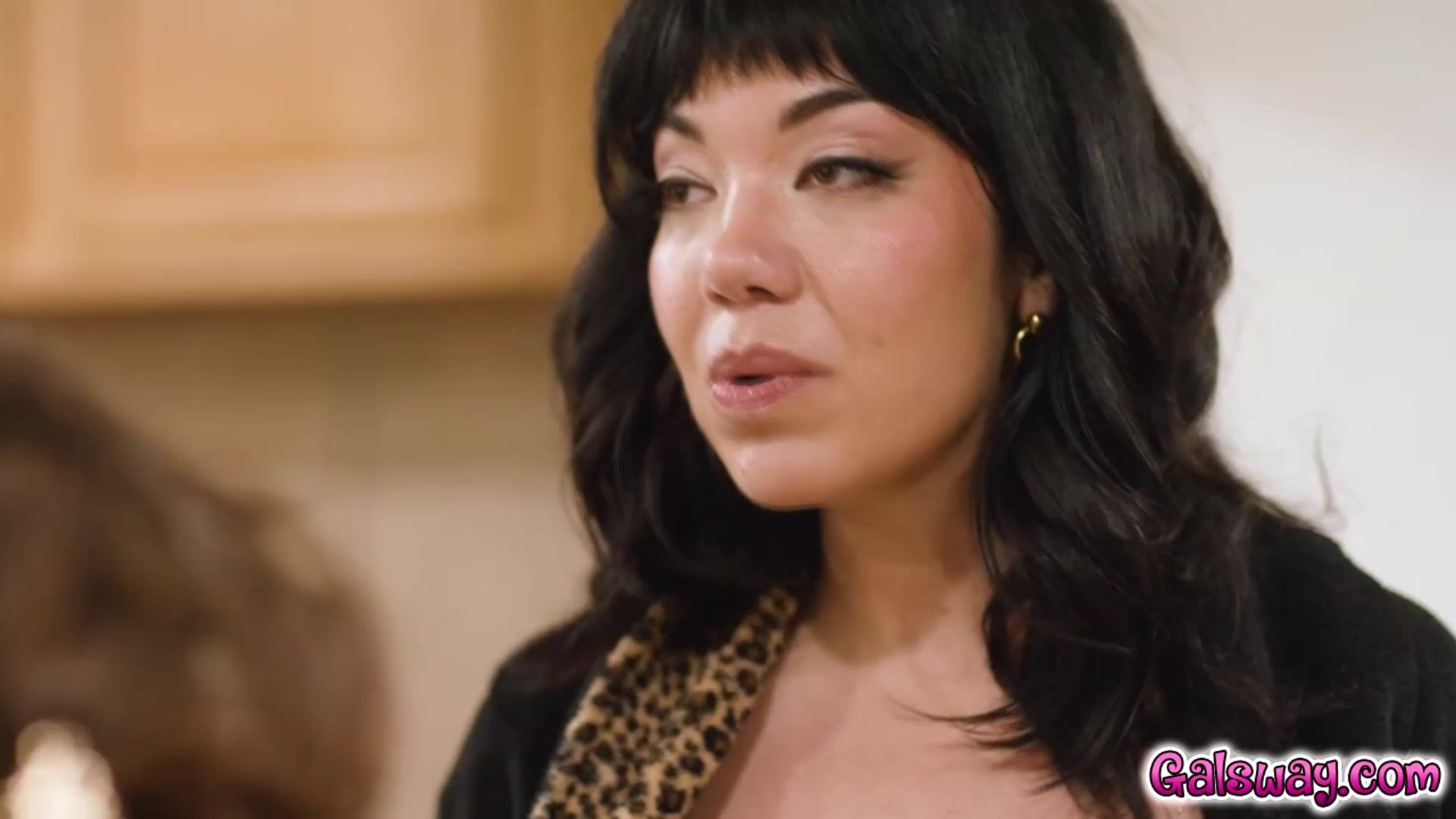 Puck steps out from behind the fridge door, Leana is shocked and tells Puck to look down. Puck does so and realizes that her robe fell open, revealing that she forgot to take off her strap-on dildo