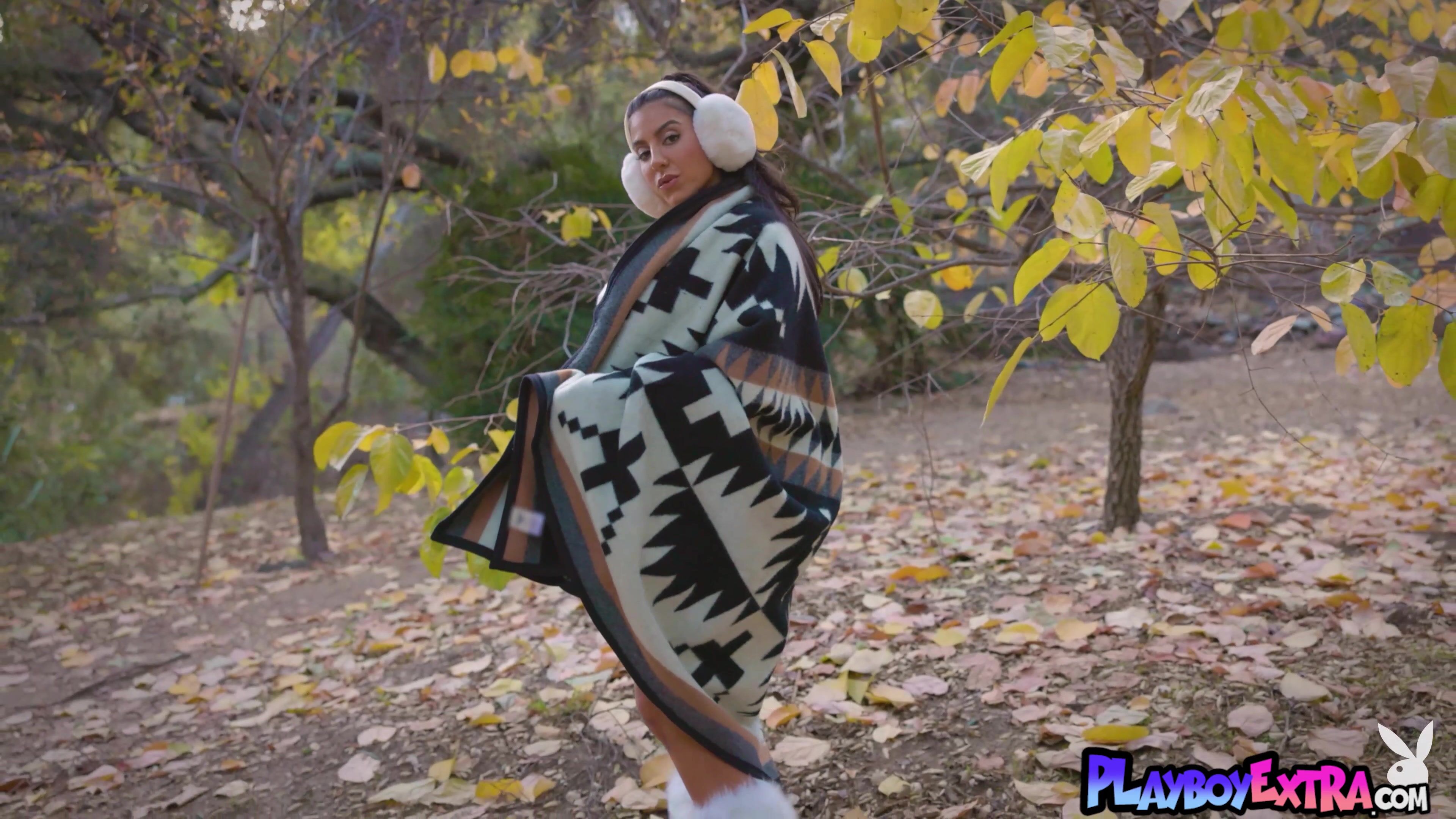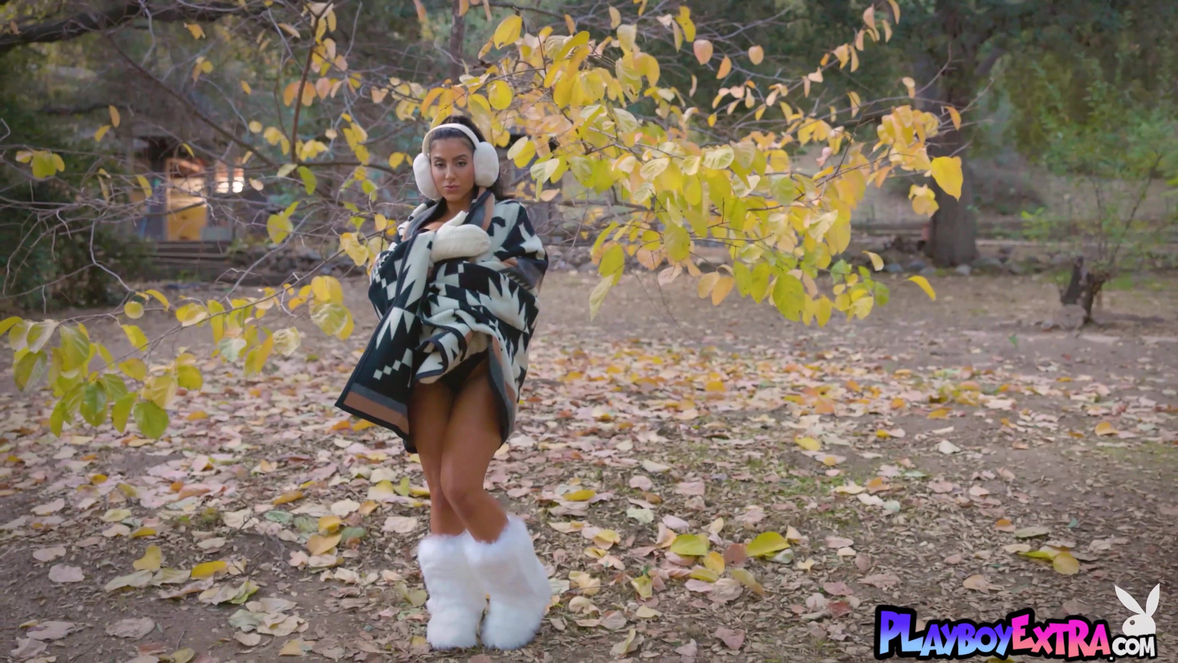 Awesome brunette MILF named Lena The Plug covered in a blanket is looking seductively into the camera She flashes her amazing big boobs for Playboy She drops off the blanket and her tiny panties then the naked muse is posing outdoor