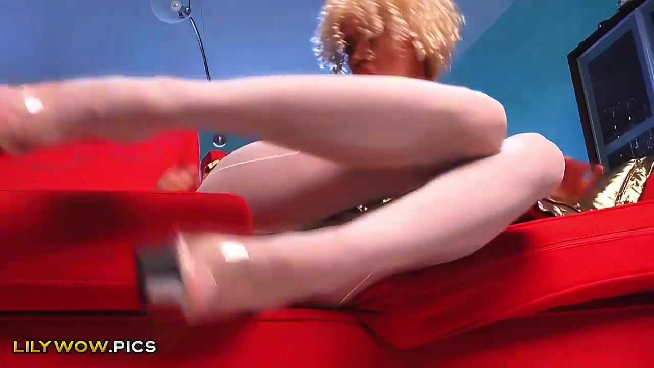 Seductive blonde MILF LilyWOW teases by her long meaty beautiful legs and plays with white nylons pantyhose