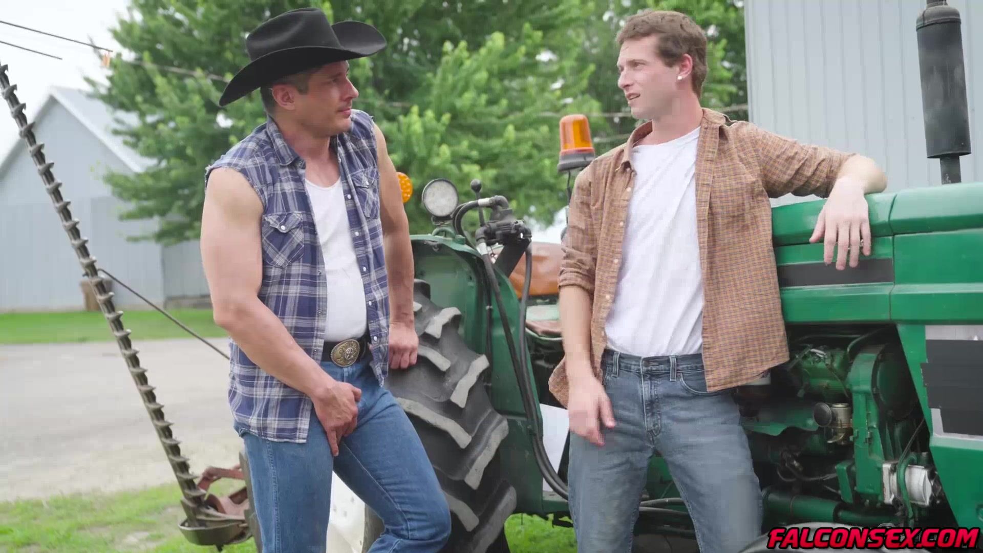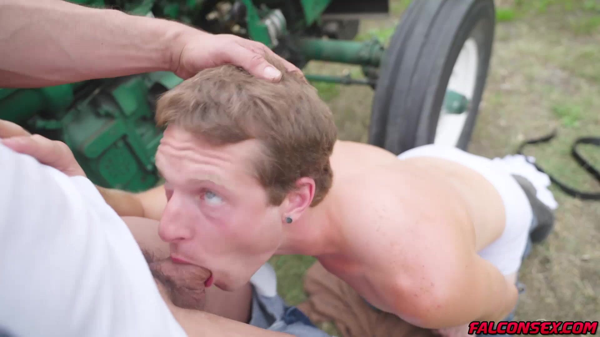 Rocky Vallarta just finished fixing Benjamin Blue's tractor and is now expecting some oral repayment. Rocky, leaning up against the tractor tire, grips Benjamin's head and toys with his hole as the twink bobs up and down on his meat to thank him for his hard work. Wanting more from his cock-hungry neighbor