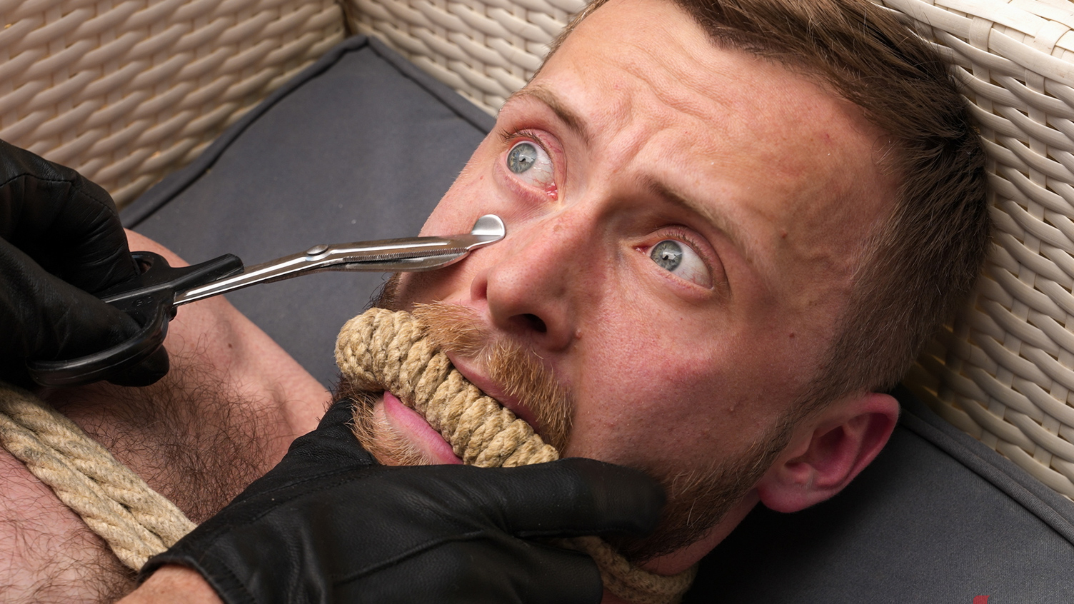 Yeah, those fucking hot gloves!! The fantastic scenario! The gag! Johnny is one the hottest men, and really enjoys spanking, gagging, and torturing Peter Dean! A mouth spreader is added to help Johnny's cock cram down Peter's slim throat and he gets throat fucked! Finally, Johnny takes Peter inside and ties him to a chair, legs spread wide for more ass fucking. Johnny indulges his toe fetish, sucking on Peter's manicured toes, before reaming Peter's ass with his hard cock!