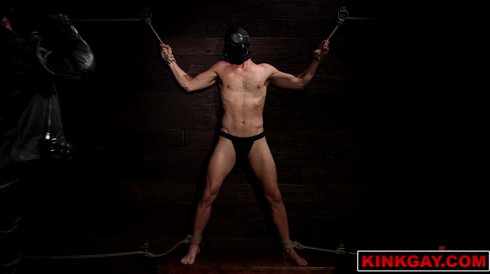 MuscleJockBound.com - Inked man in tight underwear tied up and subdued in a sensual and erotic rope bondage session in the dungeon