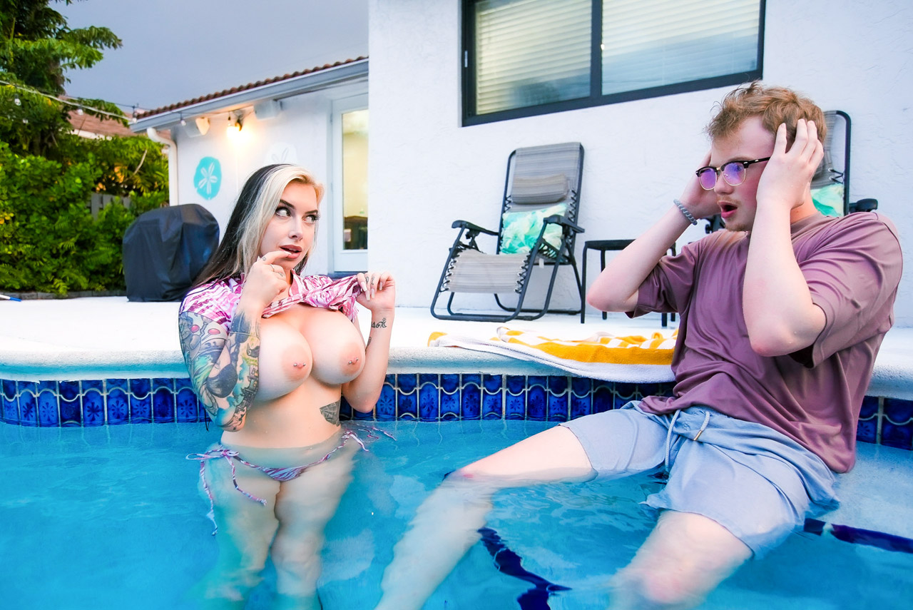 Busty german stepmom Cubbi Thompson only got married recently but needs more sex.Thats where her stepson comes in.The brunette gets into the pool and lifts up her shirt to reveil her big tits.She deepthroats his cock and lets him fuck her pussy