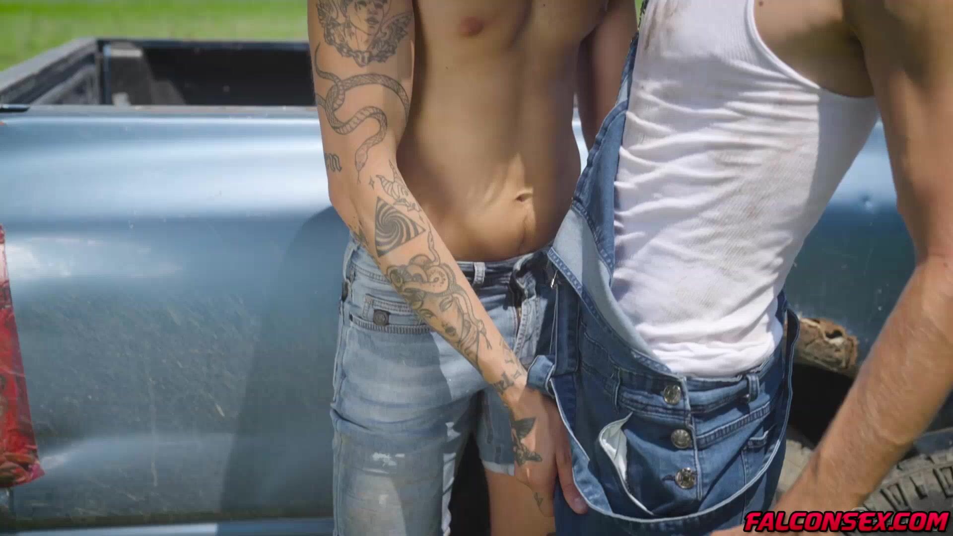 After going tour to survey Leo Louis' hired hand Angel Elias is getting the chance to know his new boss better as he sucks off the massive cock out of a rip in Leo's denim overalls. The two fuck bareback as Leo pumps himself into Angel while Angel's big uncut cock flops around.