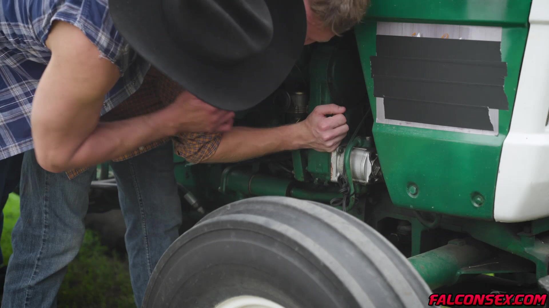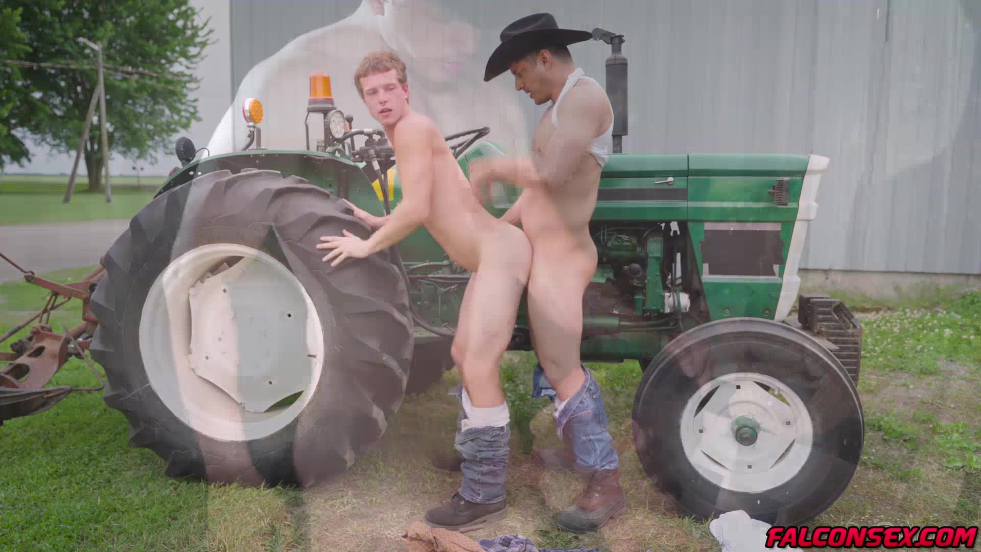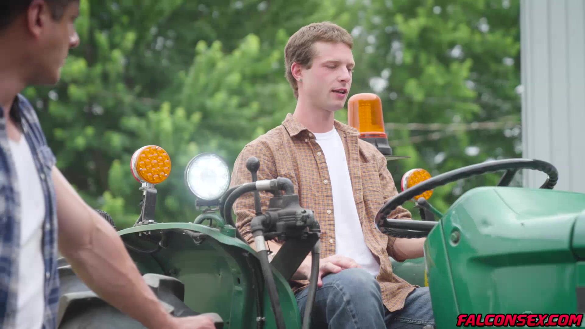 Rocky Vallarta just finished fixing Benjamin Blue's tractor and is now expecting some oral repayment. Rocky, leaning up against the tractor tire, grips Benjamin's head and toys with his hole as the twink bobs up and down on his meat to thank him for his hard work. Wanting more from his cock-hungry neighbor