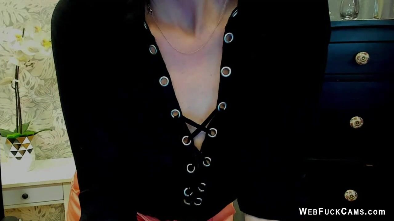 Busty German amateur blonde MILF LUXvanessa in orange mini skirt and black blouse with a big cleavage posing on webcam for fans on solo live private webcam show