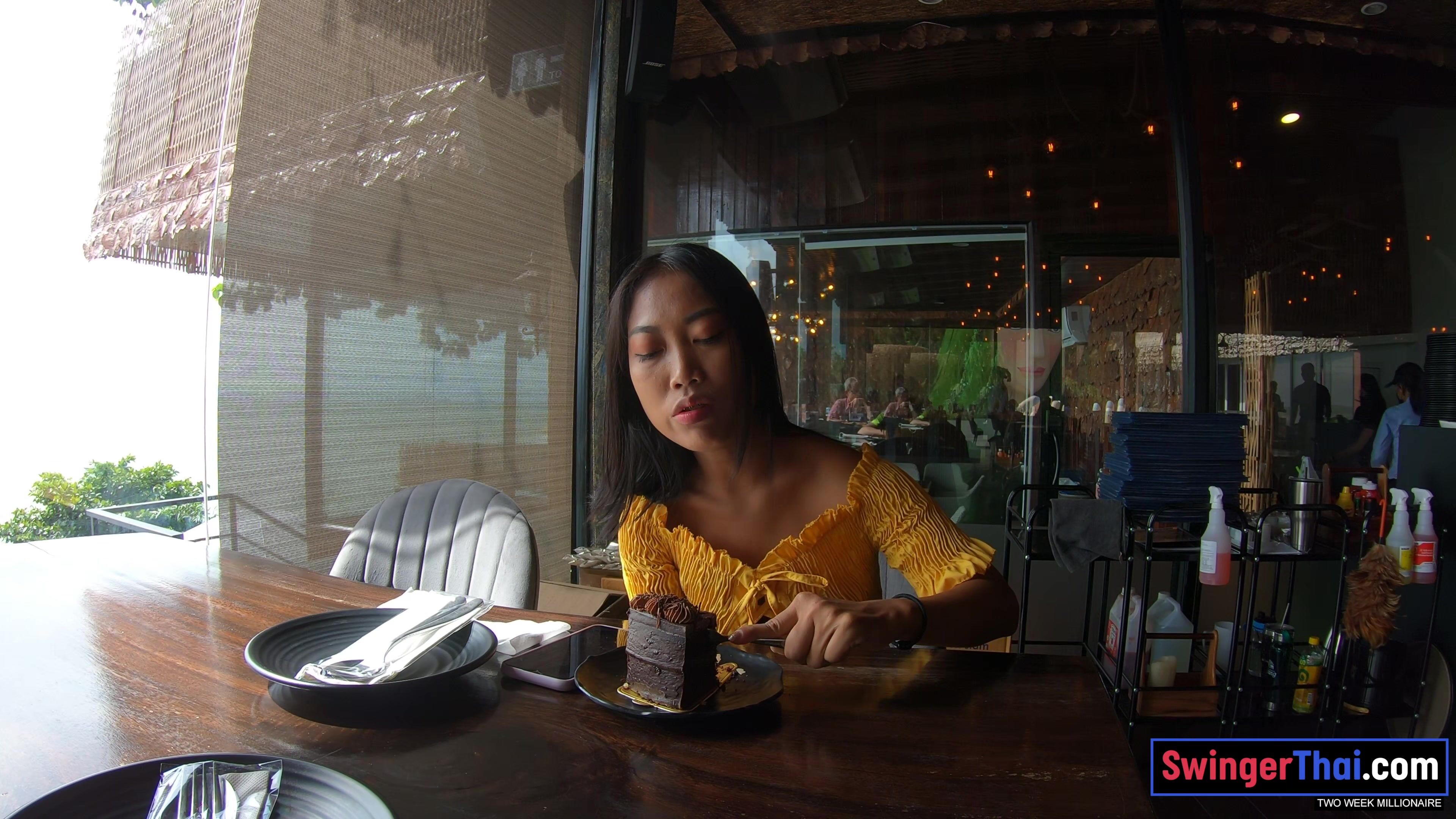 Teen GF from Thailand dirty sex at home with her big dick white boyfriend after eating chocolate cake in a restaurant! She was his two week millionaire girlfriend as soon as he landed there and did not leave his side during his whole holiday!