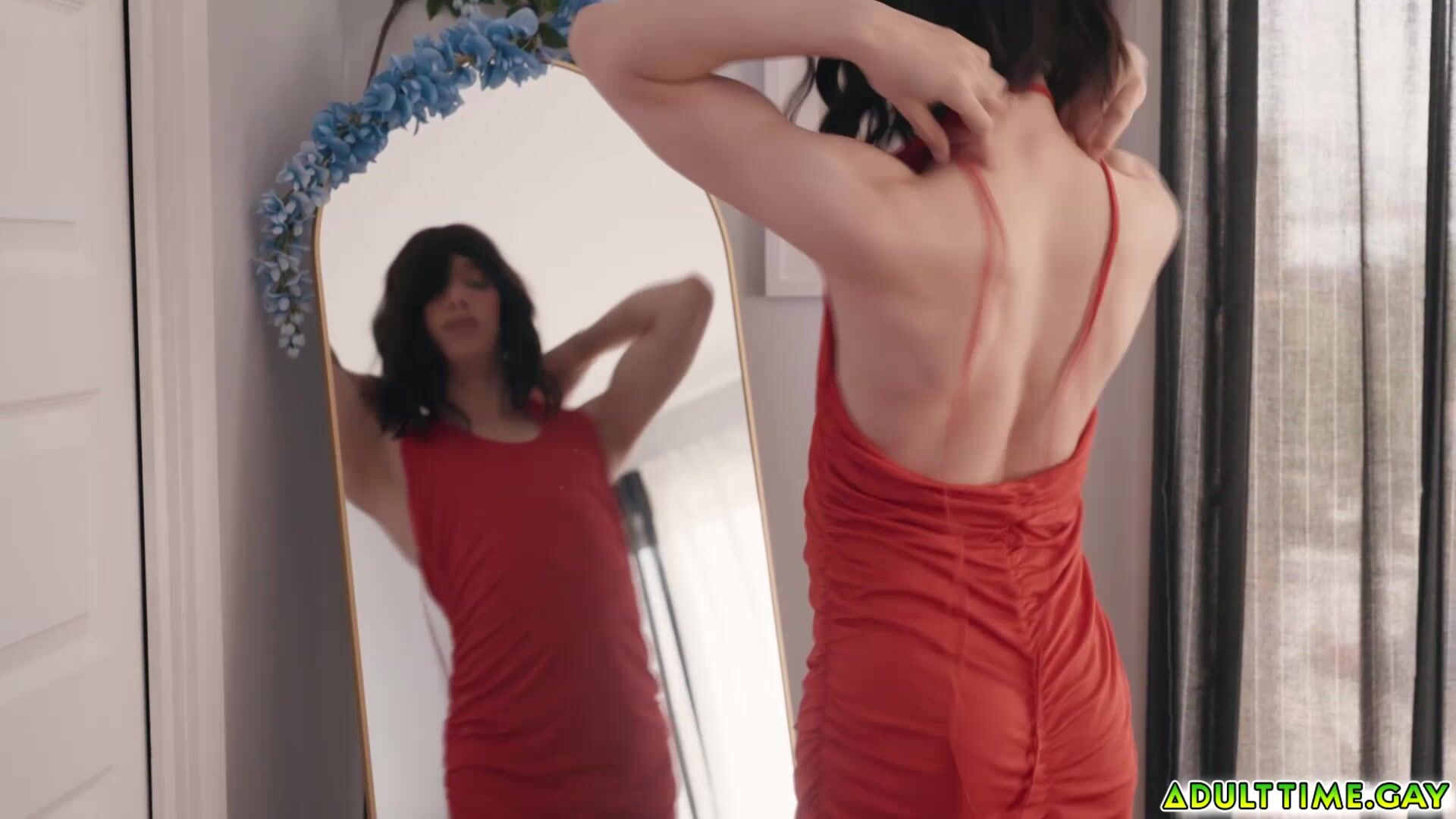 A femboy Daniel Tanner wearing nothing but panties and a bralette is in the middle of doing some spring cleaning in his bedroom Derek Kage pokes his head into the bedroom admiring the femboy with arousal and cheekily asks if he should keep the dress