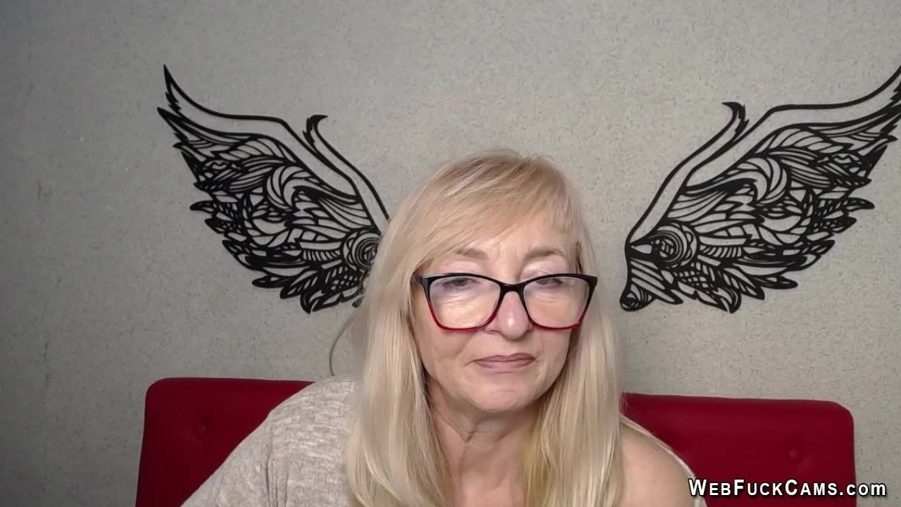 Amateur shiny hair blonde mature lady IngritSno with glasses in gray sweater sitting in chair and typing on keyboard on her solo private live webcam show in room with angels wings printed on the wall