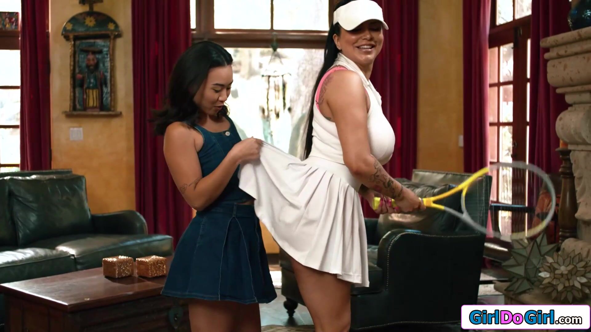 Asian stepdaughter Lulu Chu makes a deal with busty stepmom Romi Rain.She will play tennis with her but only after the milf licked her pussy.They kiss and the petite brunette sucks boobs.She gets oral and is facesitted before rimming her stepmommy