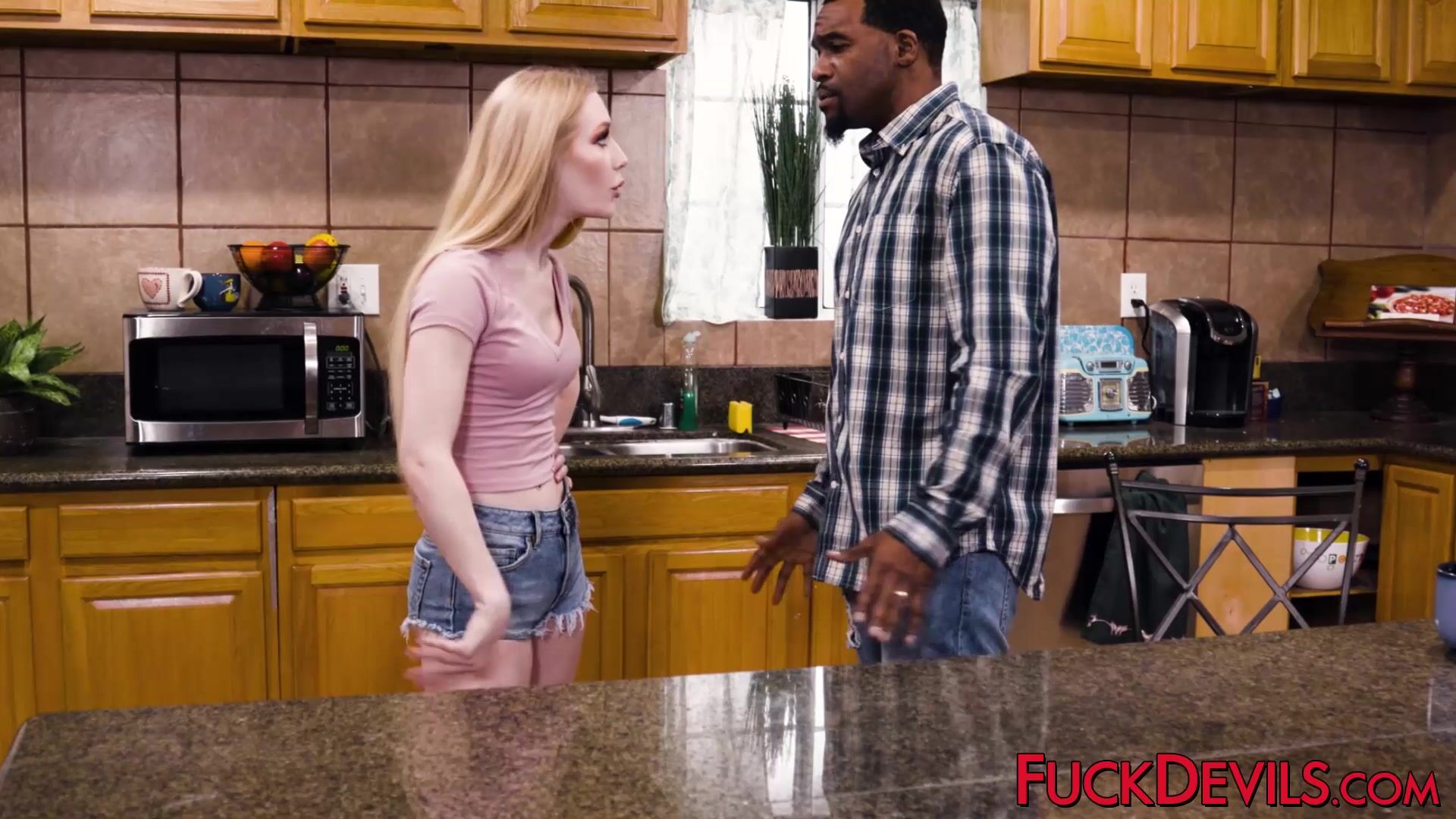 Slutty blonde teen Emma Starletto deepthroats BBC stepdad before pussy fingering and interracial drilling on kitchen counter ends with jizz on tits.