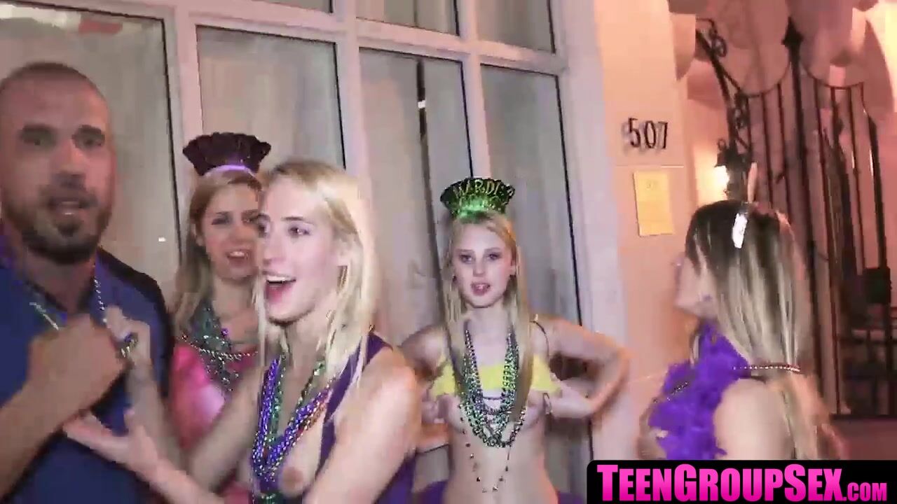 TeenGroupSex.com - Blonde amateur BFFs enjoy Mardi Gras orgy
