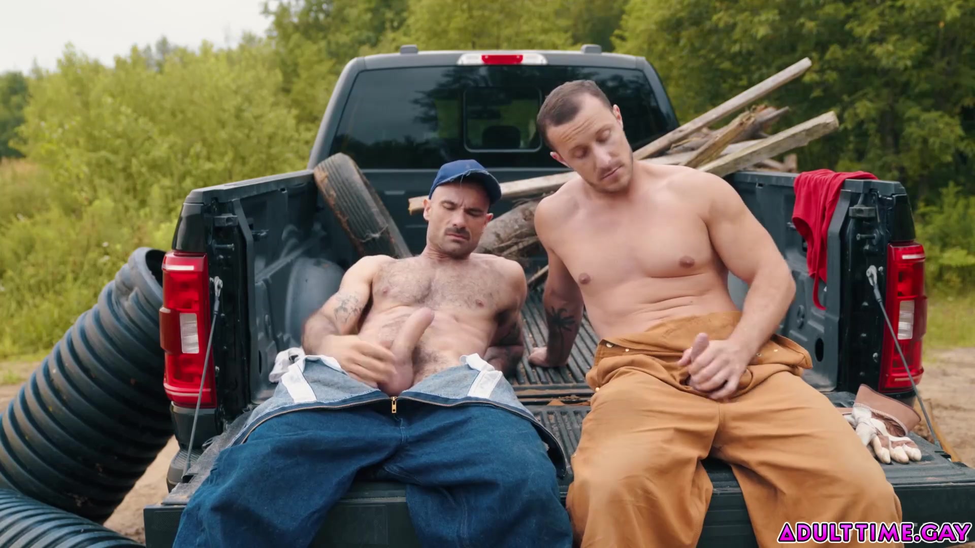 Two sweaty farmhands, Zack Mackay and Tito Patron are both sweaty after a day of hard outdoor work and they take a break to relax and jerk off together, but they end up fucking each other!