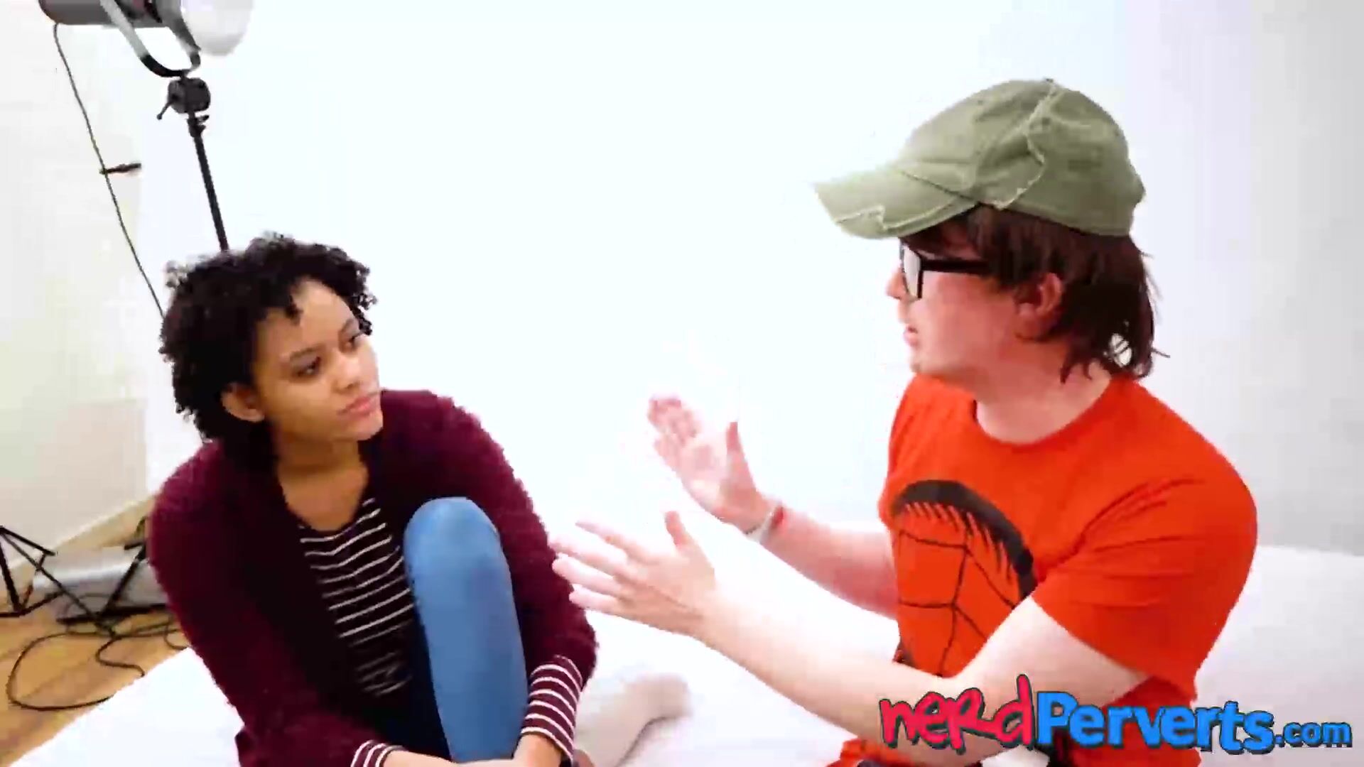 Mesmerizing ebony hottie Jade Jenson gets on her knees to service a kinky nerd by blowing him after an intense handjob.