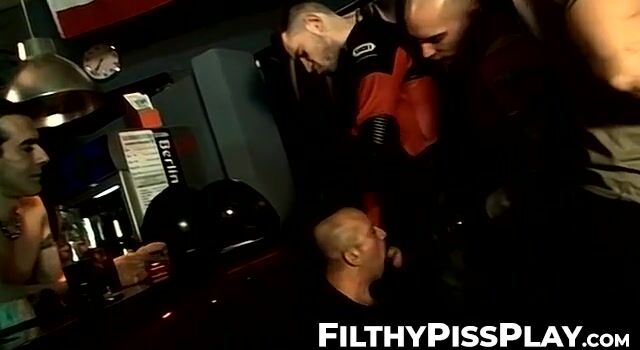 Hardcore deepthroat cock sucking and pissing group orgy with a bunch of muscle studs in underground fetish loving club.