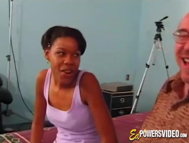Cute black girl gets naked in front of an older white man as she sucks his dick and fucks him.