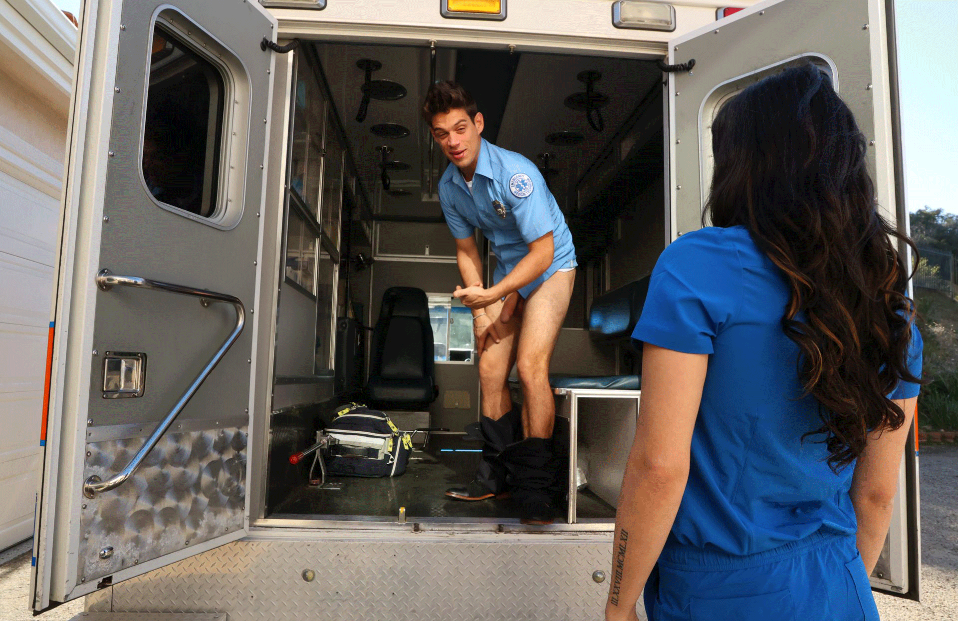 TS nurse Bailey Archer caught Michael DelRay jerking off in their mobile vehicle.Instead of getting mad,she gives him a extra hand and suck his dick passionately.In return,Michael licks and fucks her asshole and go to Tbabex.com for discount and more