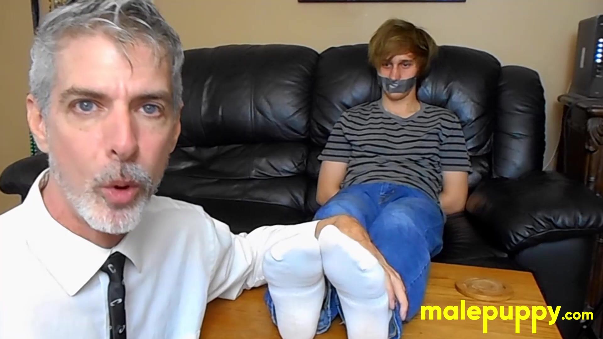 Dominant classy daddy Richard Lennox restrained young twink Elisa Taxxx and torments his feet with various items in homemade video!