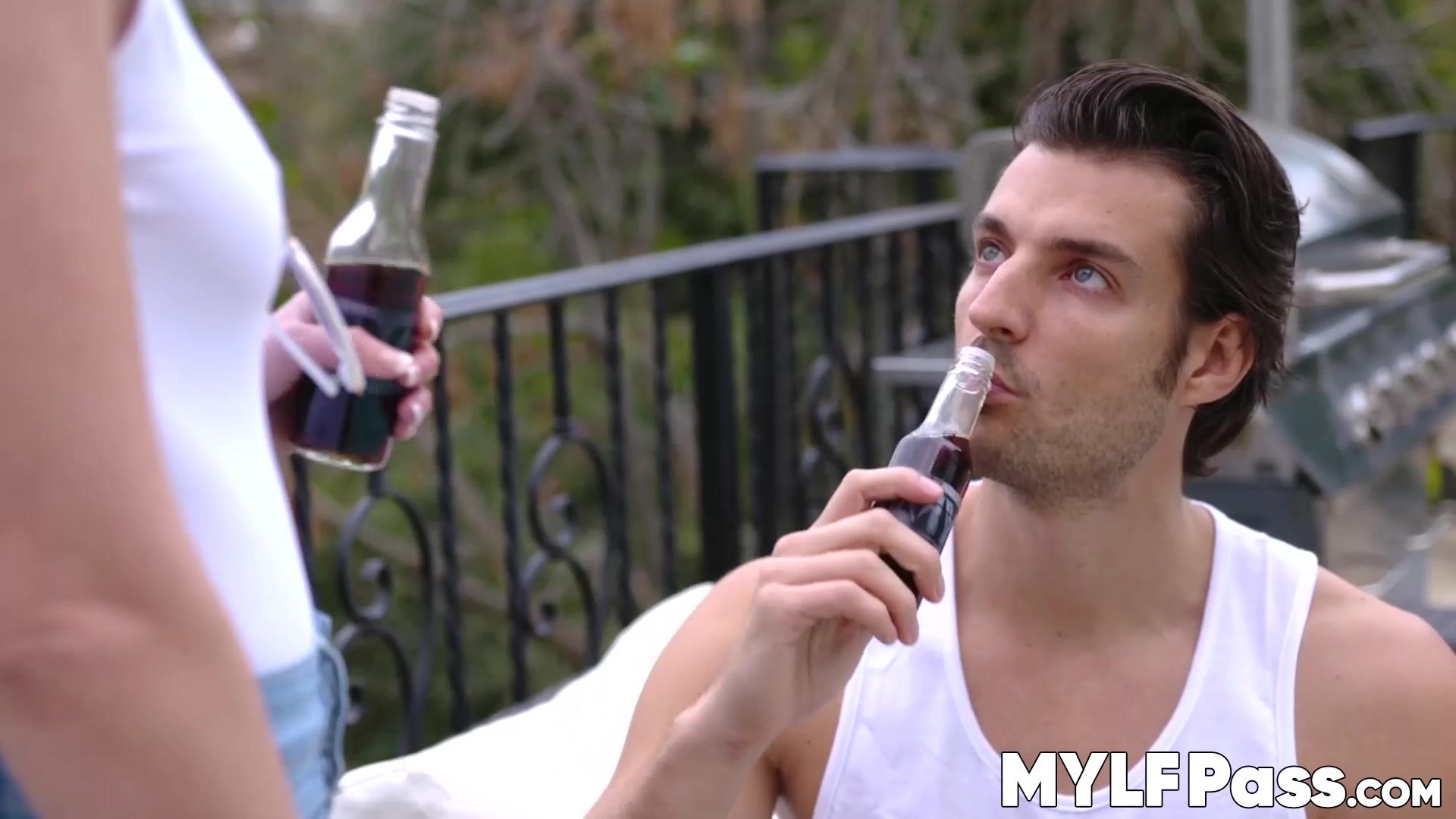 Blonde MILF Tiffany Fox runs towards sexy stud to deepthroat his big young cock before hardcore dick riding and missionary pounding.