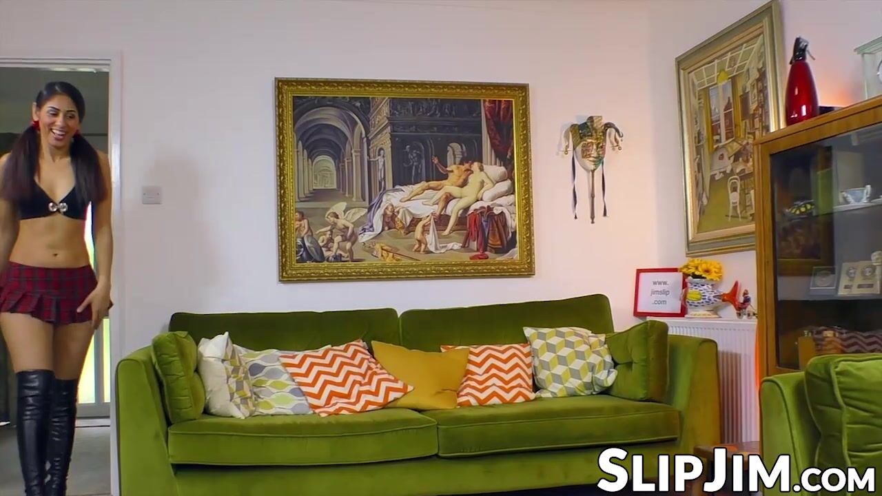 Young babe in a short skirt is eager to have an old man's cock deep in her pussy doggy before riding it.
