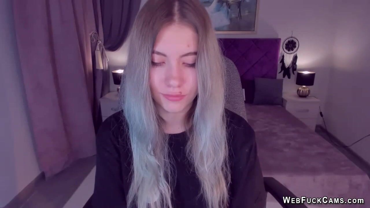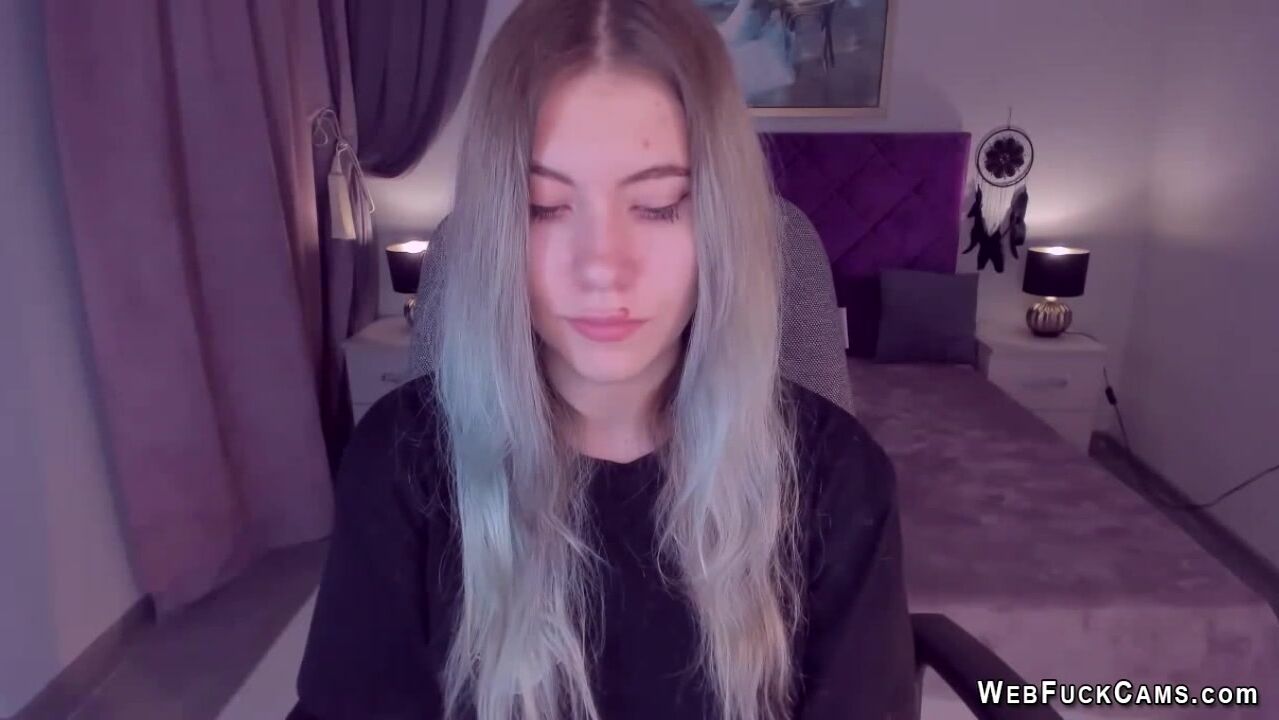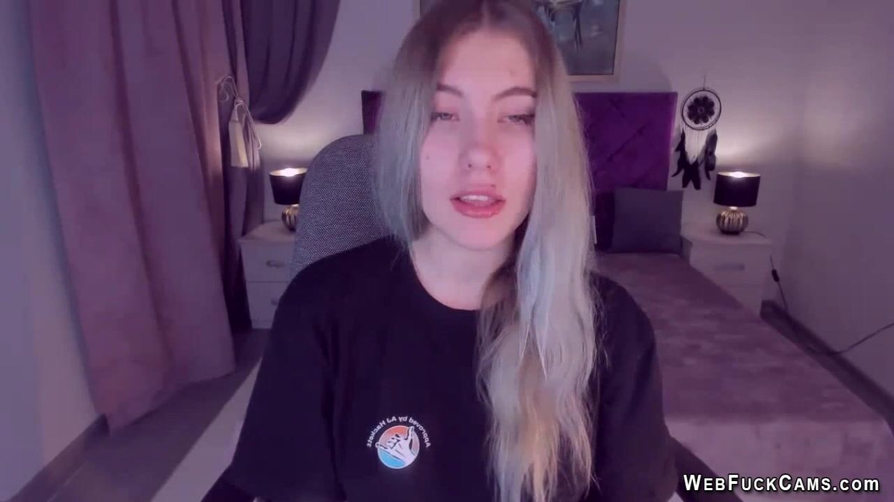 Long haired blonde Ukrainian amateur teen SimaDark chatting on her webcam with her followers then stripping naked and spreading her shaved pussy and flashing big tits on live homemade show