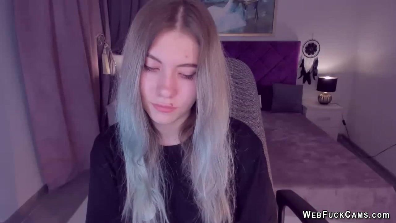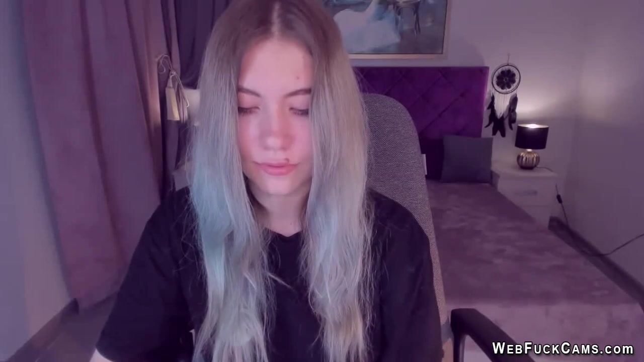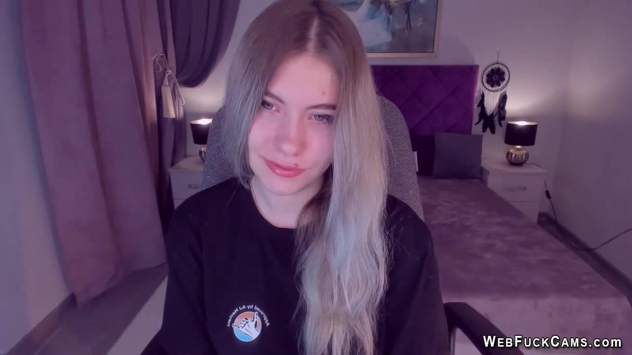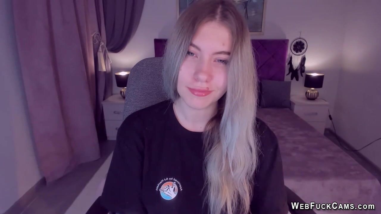 Long haired blonde Ukrainian amateur teen SimaDark chatting on her webcam with her followers then stripping naked and spreading her shaved pussy and flashing big tits on live homemade show