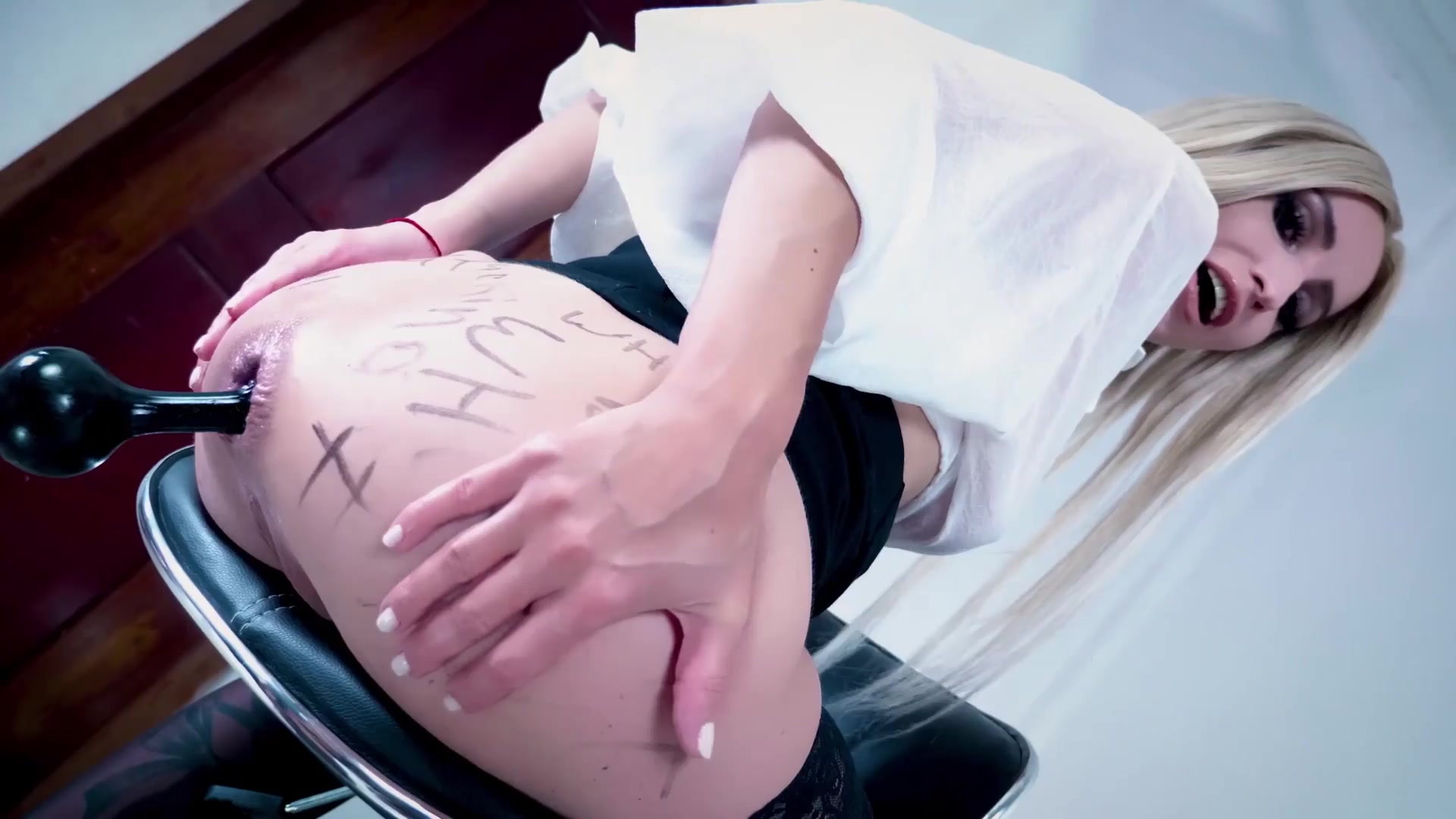 Humungous Rump Rail HUGE FAUX-COCK with Ass Fucking Buttplug on a stool