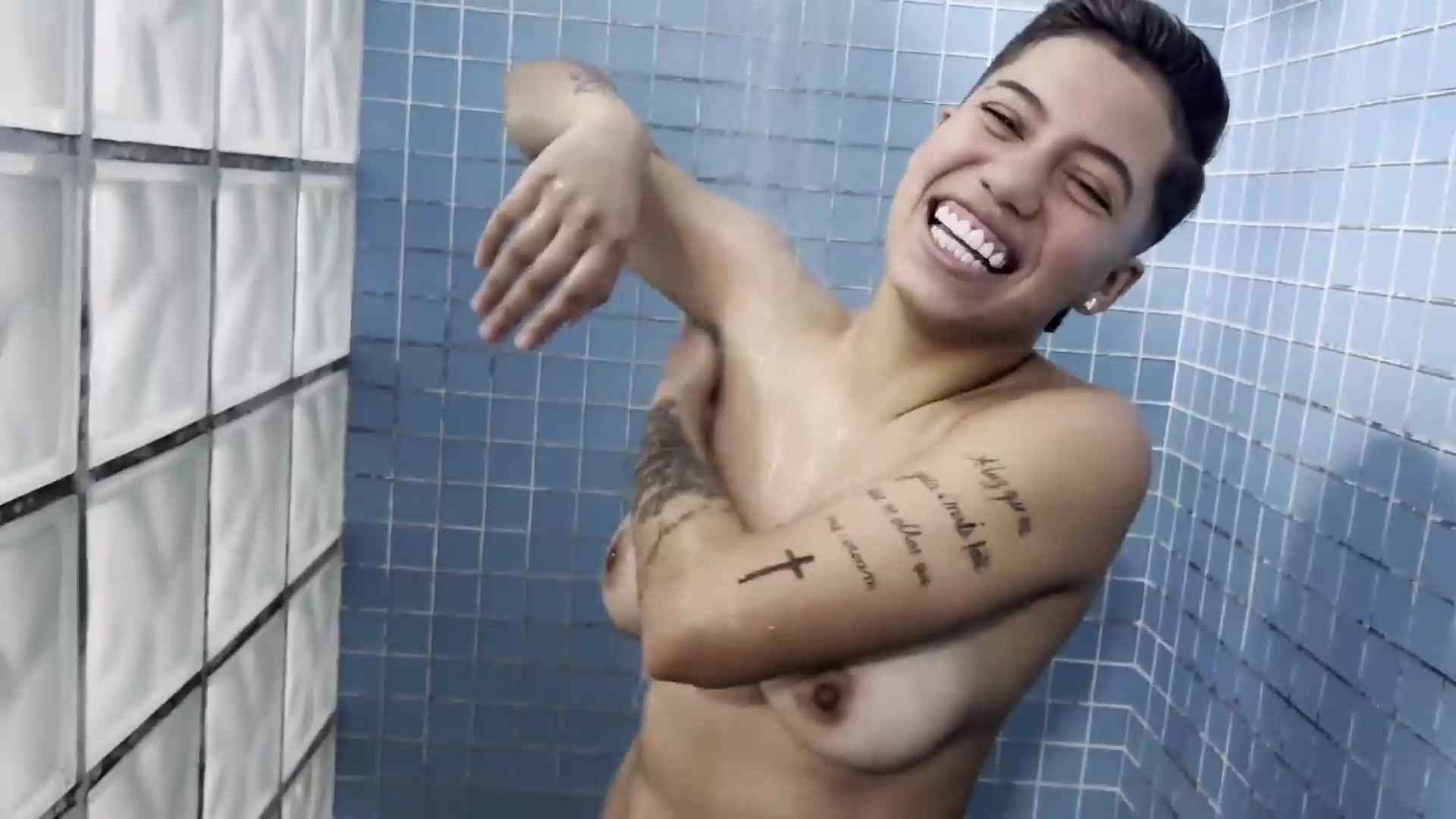 Bare teenager black-haired with monstrous, stiff boobies is tugging in the tub bath, in the morning