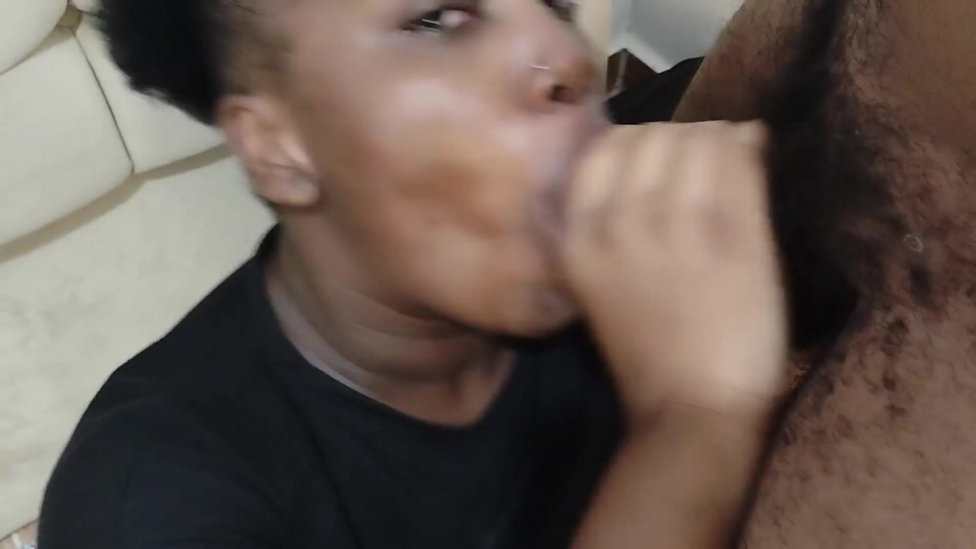 Lusty, ebony dark-haired with a giant, obese ass is throating her neighbor's boner and hoping a facial cumshot