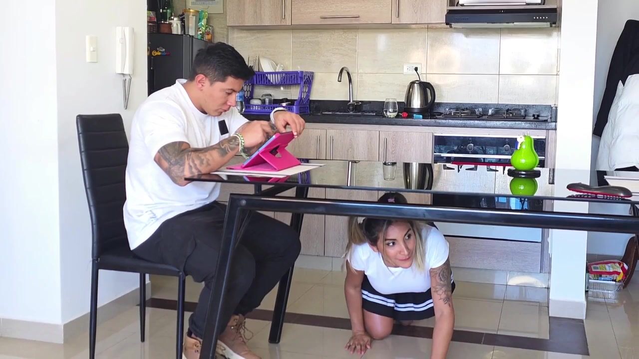 Inexperienced doll is deep-throating her roomy's weenie like a real professional, from under the table