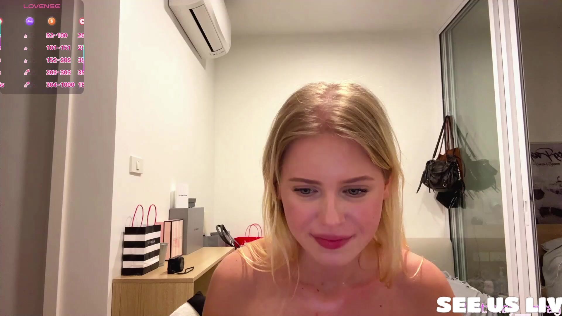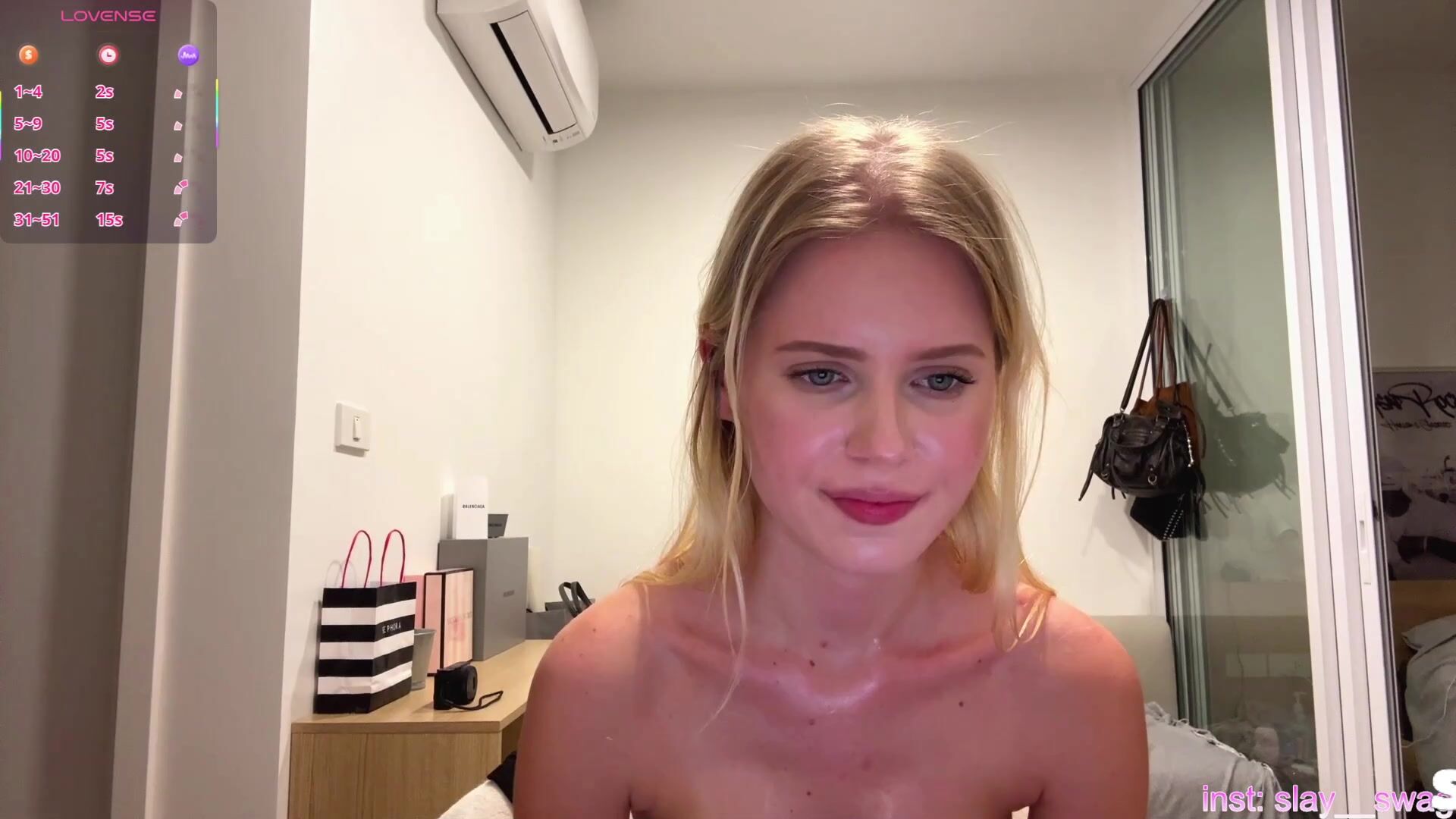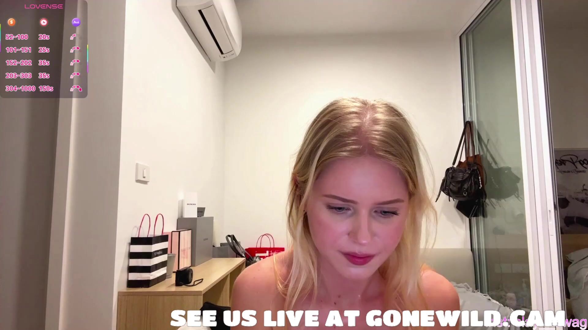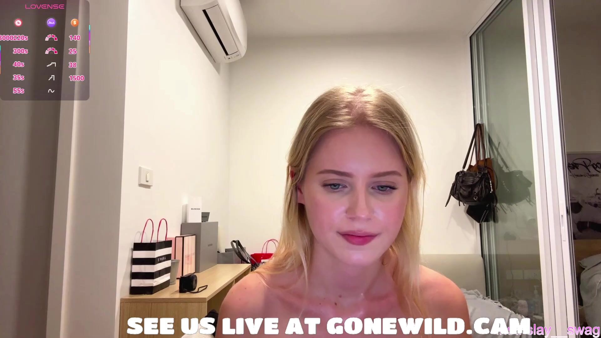Glorious blond school stunner gets frolic on web cam, forearms tauntingly adorning her naked puffy udders and pierced belly button. She turns to bend her back, showcasing off her mouth-watering bouncy ass in scanty gold g-string, smacking and stretching cheeks. Jiggish smirks and poses in mirror-packed guest room make you rock-stiff.